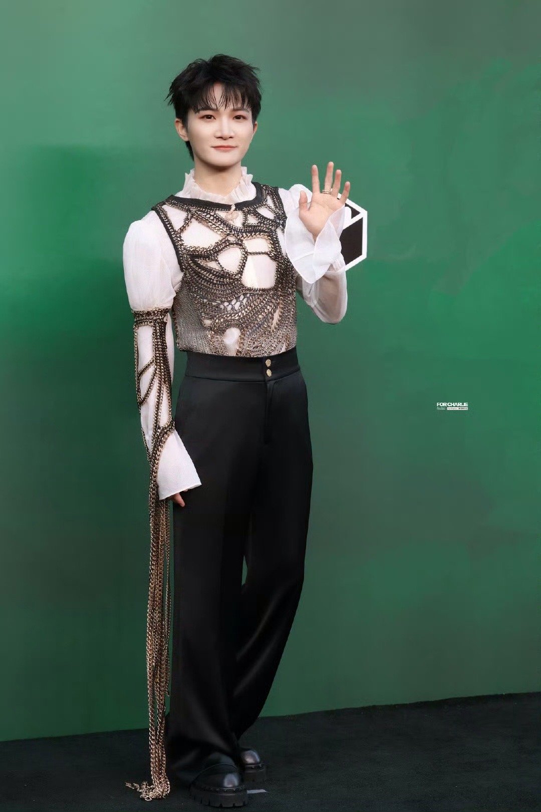 周深复古宫廷风王子周深vogue红毯生图来了,薄衬衫外搭金属链条马甲,好有设计感