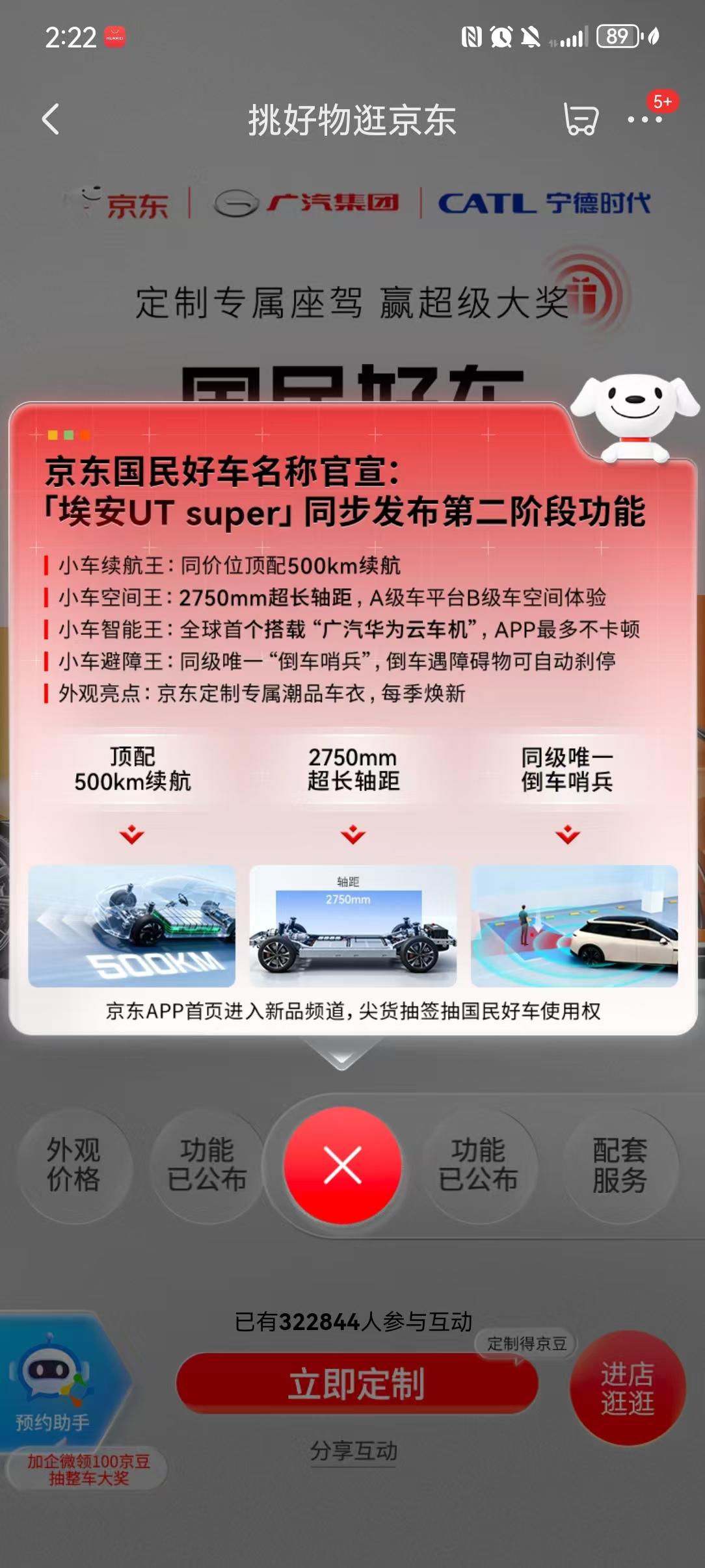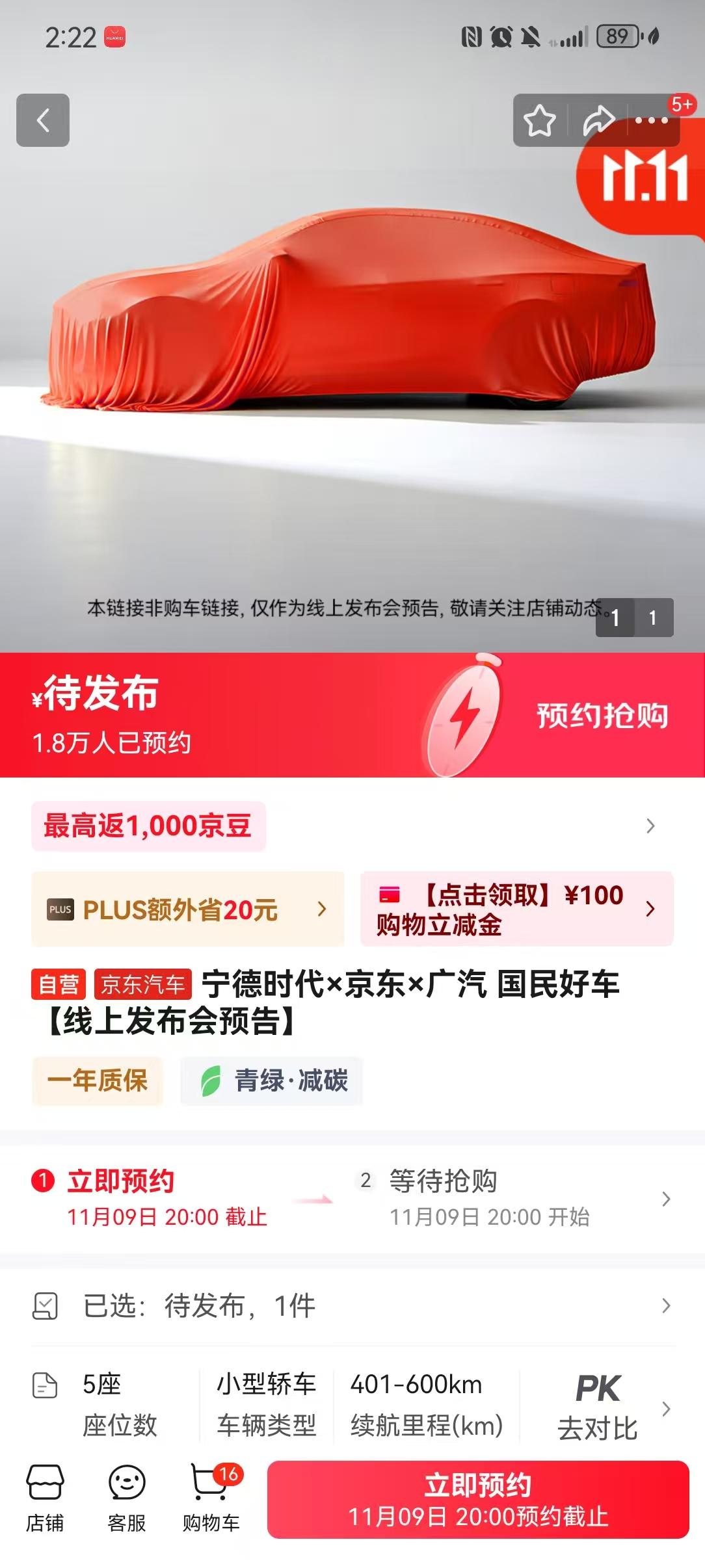 京东“国民好车”有名字了,定名埃安UT super,和广汽和宁德时代联合开发,大空间带哨兵,宁德时代巧克力的换电技术,500公里续航,支持99秒换电,果然很贴近生活。和之前猜想的一样,京东这边不造车,只负责搞渠道,打开京东APP搜"国民好车"可以预约。PS:昨天001号特别版20万人参拍,已经拍到7819万了,不知道支持不支持7天无理由退换。