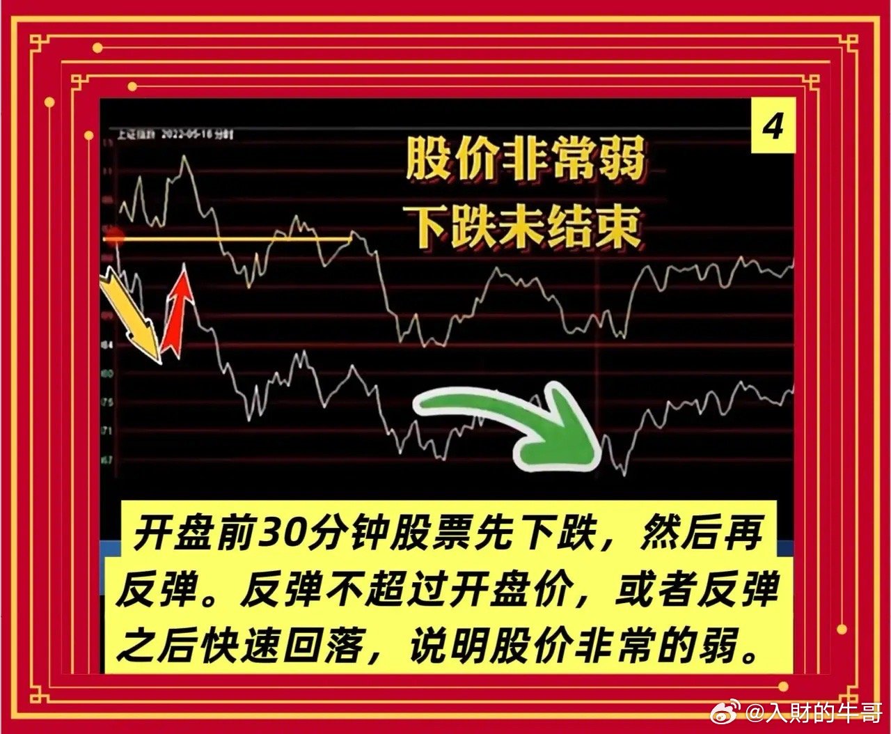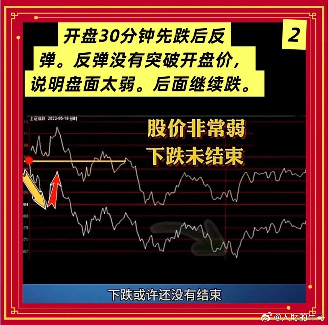 4. 开盘30分钟,股价先下跌再反弹,反弹不超过开盘价,或者反弹之后快速回落,说明股价非常弱,下跌未结束。