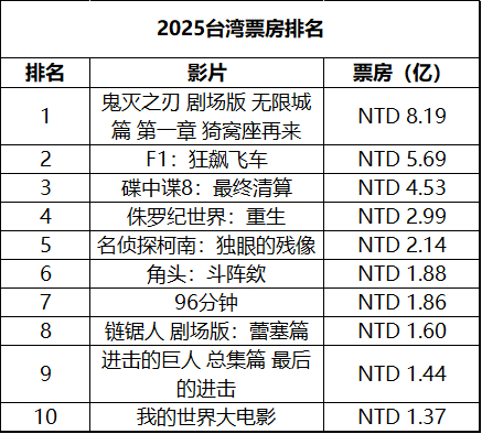 3.《鬼灭之刃 剧场版 无限城篇 第一章 猗窝座再来》累计票房8.19亿超越《速7》排名台湾影史第4;
