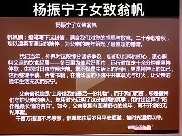 真被杨振宁子女写给翁帆的信戳中了!一句“姨”,比千言万语都重,这才是刻在骨子里的教养。 当年两人54岁的年龄差曝光时,多少人带着偏见议论,可翁帆一守就是二十多年。她陪着杨先生在清华园安度晚年,陪他开车探索,把生活打理得妥帖,杨先生都说她是“上帝给的最后礼物”。 子女们看在眼里记在心里,这声“姨”不是客套,是对她多年付出的最高认可。没有狗血争执,只有感恩尊重,这不正是杨先生言传身教的涵养传承吗? 那些曾被质疑的感情,终究被时光和真心焐成了佳话。感情里从没有标准答案,尊重与感恩才是最好的注脚。你觉得这份跨越时光的情谊最动人的地方在哪?