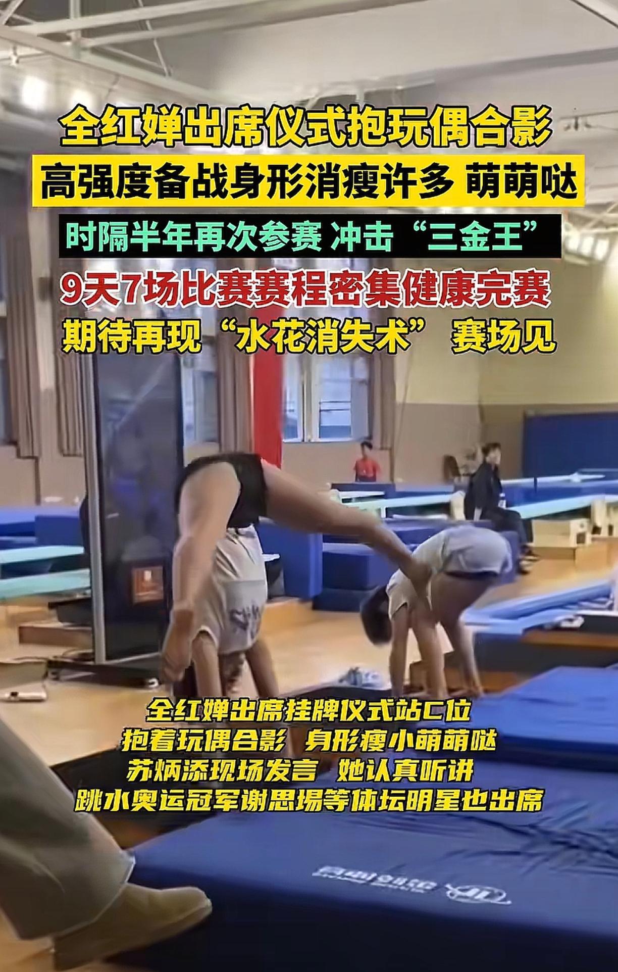 近日,全红婵出席仪式抱玩偶站C位,身形消瘦了很多,最近都在高强度备战全运会,据她教练透露,在广东二沙训练中心队内测试,全红婵已经攻克了过去的技术短板,自选动作468.2分,上届全运会,全红婵拿了两枚金牌,这次报名了团体、双人和单人三个项目,目标三金满贯,期待全红婵的水花消失术,一起为她加油吧!(图片来源于网络侵删)