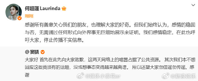 何超莲窦骁回应何超莲 我们感情稳定 23日,回应近期网上热议的自己与闹离婚等传闻,“我们本不想回应这些莫须有的话题,没成想事态变得越来越离谱”,希望大家勿信谣勿传谣,何超莲转发:“我们感情稳定。”