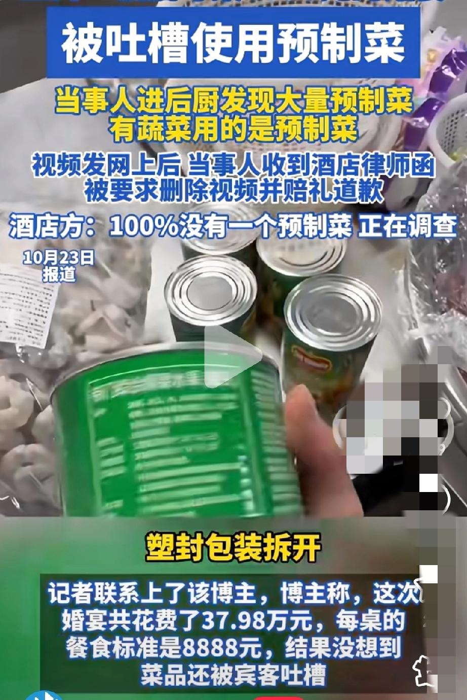 万万没想到, 罗永浩和贾国龙估计都懵了, 这预制菜的风波刚歇脚,上海万豪酒店又把自己架火上烤了! 花37万多办婚宴,8888一桌的标准,后厨竟堆着现成的预制菜,咸猪手、八宝饭全是包装好的,新鲜虾变冷冻虾,贝壳里都没肉。更气人的是,酒店先说“100%没预制菜”,转头就发律师函逼删视频道歉,这操作和西贝当初一模一样。 其实没人绝对反对预制菜,但六部门早说了得明着来,这是消费者的知情权。花高价买的不仅是菜,更是婚宴的仪式感。酒店与其急着发律师函,不如好好解释为啥承诺的现做变预制。 我在家就能吃预制菜,结婚就想吃点现做美食,不然花大价钱干啥。这如果真是预制菜的话,酒店被爆出来的话,不冤!大家怎么看?