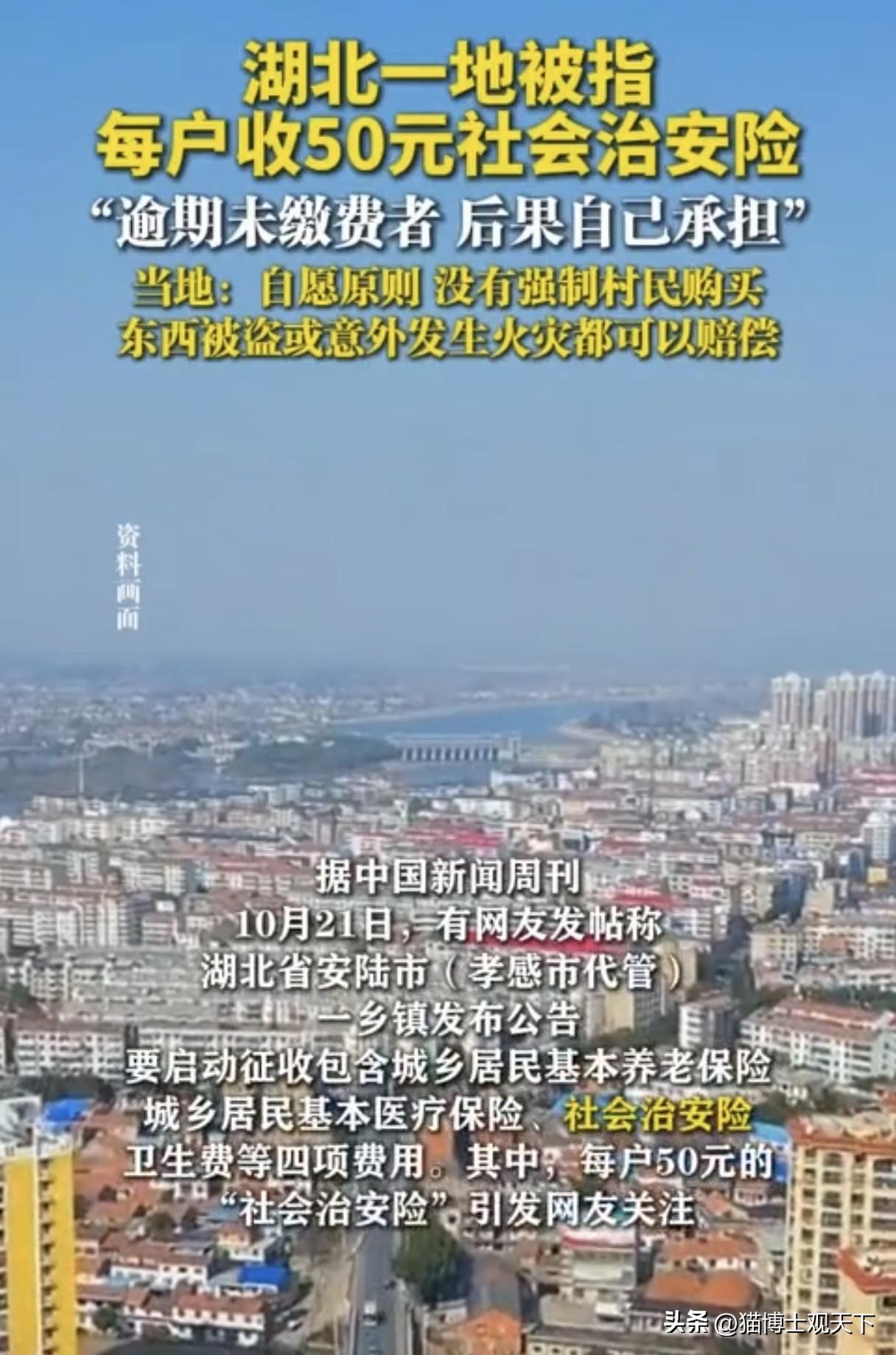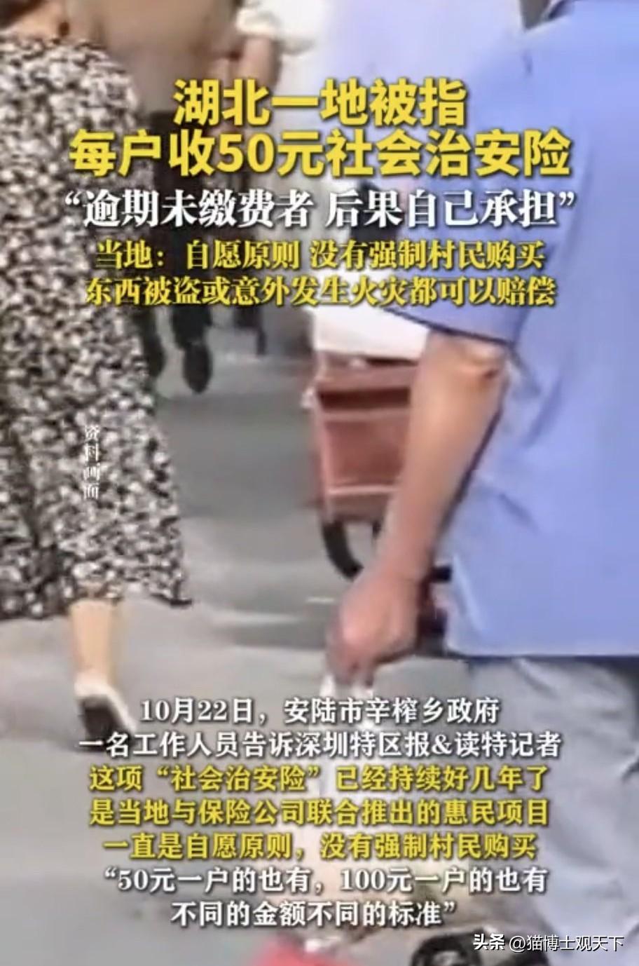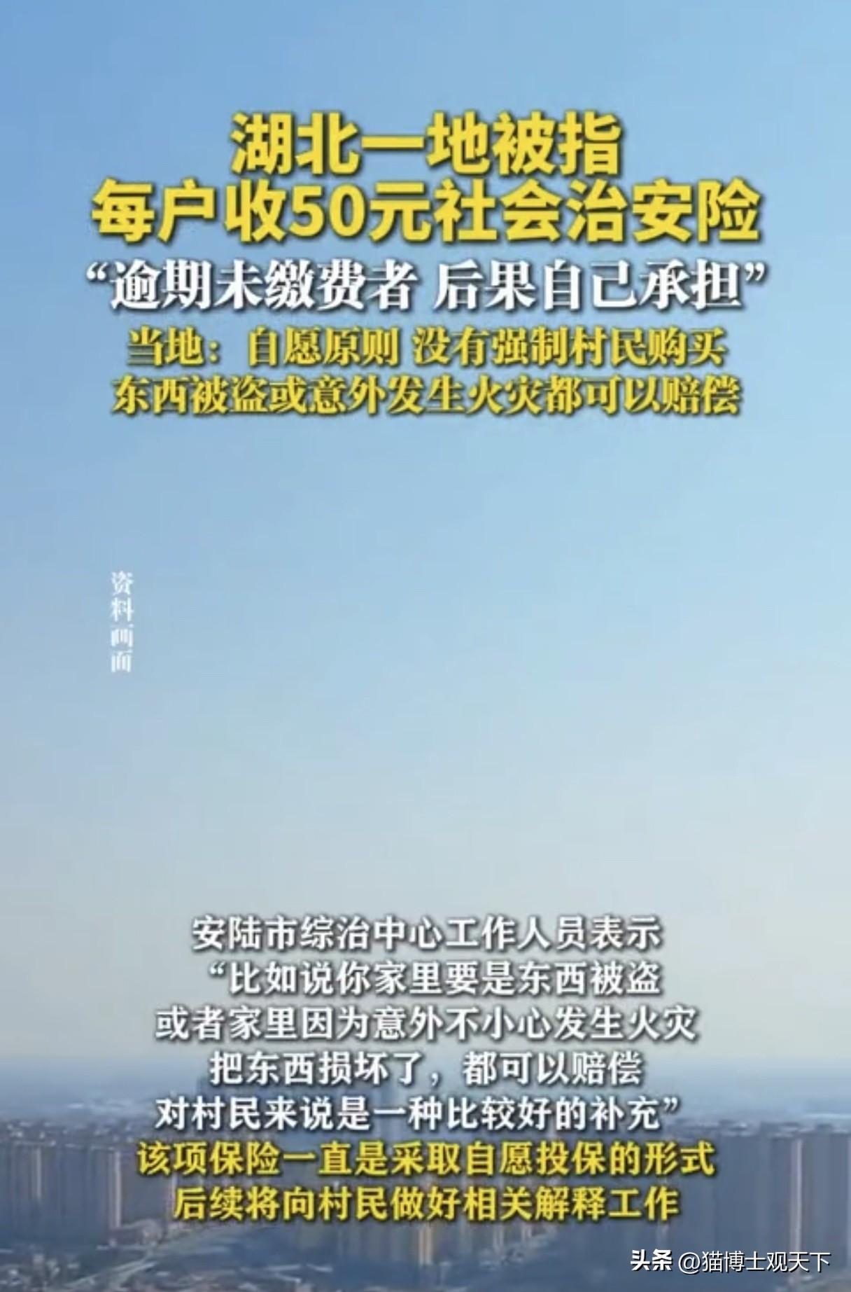 笑死,明目张胆收社会治安费,每户收50元,还说是自愿选择,不交的话后果自负! 湖北安陆市某乡镇,要求收每户50元的社会治安险,如果逾期不交,后果自负!该收费行为引起广大网友热议! 当地官方回复是说,这是自愿原则,一些钱主要用于村民财产损失的一个赔偿。比如,家里东西被盗了,或者发生火灾有东西损坏了都可以得到赔偿。 对于这种解释,大家都不认同,看看大家都怎么说。 🈶网友表示:“后果自己承担”,好吓人。到底是什么后果?到底自己能不能承担?如果不能承担又是什么后果?真的好怕呀! 也🈶网友表示:照这工作人员的解释,没交这个保险的家庭,很有可能会发生火险和绝对破不了的盗窃事件。 还🈶网友表示:维护当地治安,保护老百姓财产权益和人身安全不是当地政府应该做的吗?这还有收钱?真的是新鲜事呀! 不知道大家对此事怎么看?欢迎留言一起探讨交流。