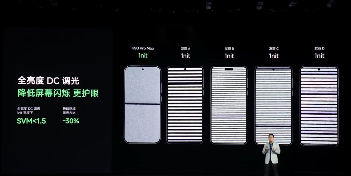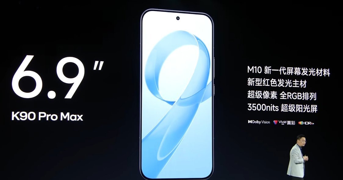 REDMI K90 Pro Max 采用一块1.5K分辨率、 6.9 英寸 2608×1200 OLED 直屏,华星 M10 发光材料(新型红色发光主材),超级像素(Real RGB),手动最高亮度 600nit、全屏激发 2000nit、25% 窗口局部峰值亮度 3500nit,最低亮度 1nit,120Hz 刷新率(LTPO),默认全亮度类 DC 调光,圆偏振光 2.0,全链路 10bit 色深。