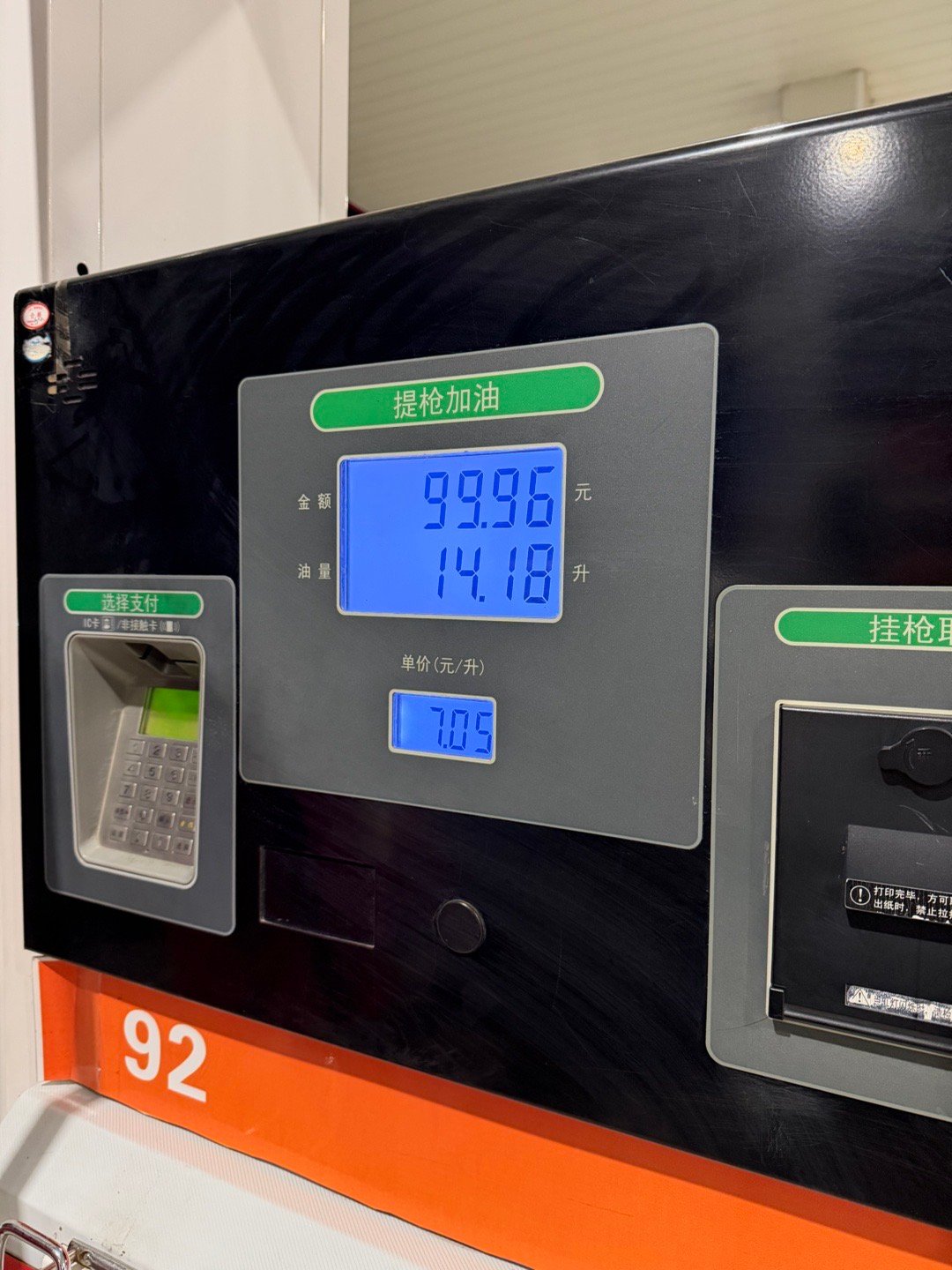 好多年没有加过92号油了,没想到智己这个1.5T可变涡轮截面发动机可以加92号油,现在北京92号油价7.05元每升,感觉不贵。