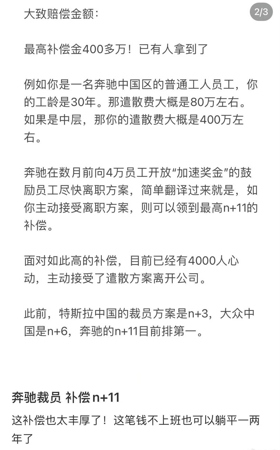 网传奔驰裁员补偿N+11,一般工龄的,都能拿到大几十万,奔驰还是有钱~[good]