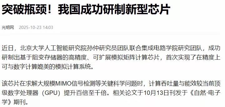 光明网一个报道,看得人热血沸腾。 芯片又有新突破,这次是北大搞出来的 说这种芯片计算吞吐量与能效较当前顶级数字处理器(GPU)提升百倍至千倍。 传统芯片是冯诺伊曼结构,而当下这种芯片,用的不是这种结构。 冯结构,算是算,存是存。通过0与1两个数字,进行解码与传输。 但是这种最新芯片,不用二进制数字交流,而且不用过程数据存储 直接将计算与存储,合二为一了。 要是用咱们生活里的事儿打比方,传统冯诺伊曼芯片就像家里的厨房和冰箱分开老远——想炒菜得先从冰箱里拿食材,炒到一半缺东西又得跑回去取,来来回回浪费不少时间。而北大这新芯片,相当于把冰箱直接嵌在了灶台旁边,伸手就能拿到需要的食材,不用多跑一步路,效率能不高吗? 咱们平时用电脑、手机,要是多开几个软件就卡得不行,玩个大型游戏还得担心显卡过热,其实都跟传统芯片的先天不足有关。它的计算和存储各干各的,数据在两者之间传输时总会有延迟,就像两个人传话总比自己直接做慢半拍。现在把这俩功能捏到一块儿,数据不用来回跑,不仅算得快,还特别省电——以后说不定手机充一次电就能用两三天,笔记本电脑也不用拖着厚重的散热板了。 更关键的是,这突破不是小修小补,是从根儿上改了芯片的设计逻辑。以前咱们总说芯片领域被卡脖子,很大程度是因为大家都在冯诺伊曼结构的框架里打转,核心技术绕不开别人的专利。北大这次跳出了这个圈子,不用二进制、不搞数据存储,等于开辟了一条新赛道,这可不是简单追赶上别人,而是有机会跑到最前面去。 可能有人会问,这芯片现在能用上吗?别急,任何技术从实验室到量产都得有个过程,但这个突破的意义已经很不一般了。你想啊,现在人工智能、大数据这些领域,对芯片的要求越来越高,普通GPU早就不够用了。要是这新芯片能批量生产,以后训练一个大模型的时间可能从几个月缩短到几天,医院里的CT影像分析能更快出结果,甚至自动驾驶的反应速度都能再提一个档次。 而且这事儿最提气的地方在于,是咱们自己的高校搞出来的。以前总听说国外哪个实验室又有新发明,现在北大用实打实的成果告诉大家,咱们在芯片核心技术上也能拿出硬东西。这不仅是技术上的突破,更给整个行业攒了股劲儿——以后不用总盯着别人的脚步,咱们也能走出自己的路。 当然,也不能光高兴忘了客观看问题。新芯片要真正落地,还得解决量产、成本、兼容性这些实际问题,这些都需要时间和更多人的努力。但不管怎么说,这第一步已经迈得很漂亮了,接下来就看能不能把这个优势保持住,让更多好技术从实验室走进咱们的日常生活。 各位读者你们怎么看?欢迎在评论区讨论。 中国高科技芯片 芯片发展新格局