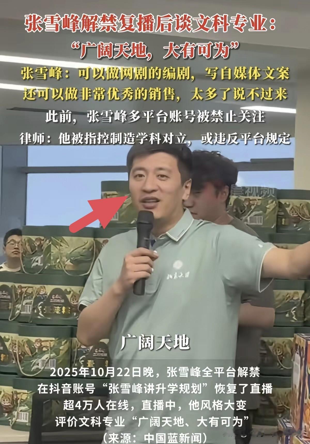 张雪峰老师你可长点心吧, 再这样闹下去恐怕就不是“限制关注”这么简单了。 为啥这么说呢?明眼人都看得出来,张雪峰账号被限制关注了一段时间,这段时间你就好好的闭门思过就行了呗,没想到刚一解封复播,张老师就在直播间10几万观众面前大谈文科专业“广阔天地,大有可为”,啪啦啪啦说了一大堆。 问题是你这前后判若两人,给人感觉明显就是刻意为之嘛,故意表演给观众看的是吗?就怕造成此地无银三百两,越描越黑的效果啊。 我个人认为张雪峰应该低调一点,在直播间这个话题与其这样说,还不如不说。大家觉得呢?