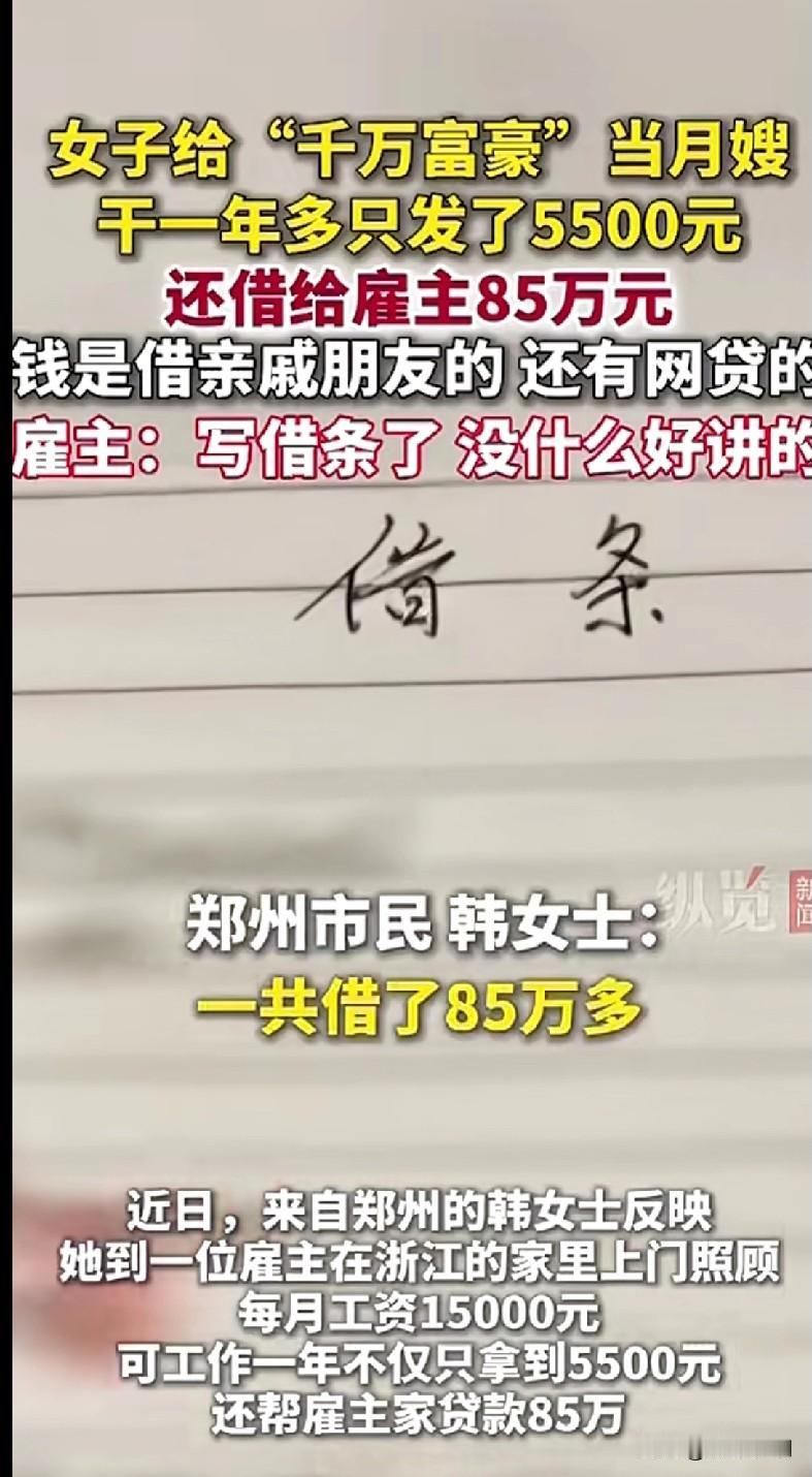 家人们快来看这离谱事!郑州一姐妹给“千万富豪”当月嫂,说好月薪1万5,干了一年多就拿到5500块,更绝的是还借了85万给雇主,钱还是找亲戚朋友借的加网贷! 现在找她要钱,雇主就甩一句“写借条了,没什么好讲的”。咱就说这保姆当的,工资没拿到还倒贴八十多万,这“富豪”怕不是个骗子吧? 打工人找工作可得擦亮眼睛,别被高薪忽悠了,遇到这种让你借钱的雇主,赶紧跑!希望这姐妹能把钱要回来,这种离谱操作真的是活久见!