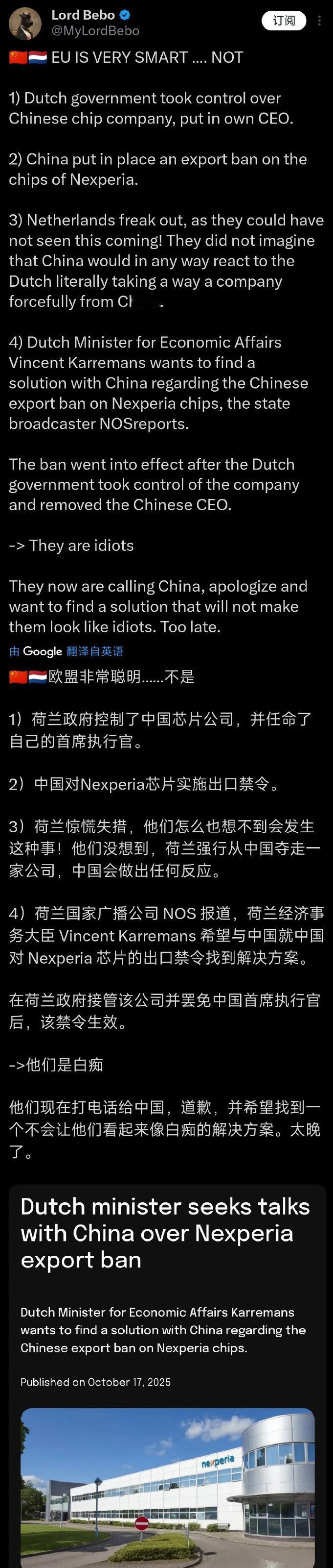很好,正式切割!让海盗们抢了个寂寞,然后再付出相应的代价……这一切,都是为了我们海外资产今后的安全。 安世中国发表声明称,荷兰总部相关决定在中国境内不具备法律效力……这意思再明白不过——你们自己躲那空房子里慢慢嗨去吧。 这个结果舒适!荷兰折腾半天,只拿到个空壳子,却把国家信誉、国家关系和许多商业机会都赔上了,可谓是得不偿失。这起事件,应该是一个模板,以后再有国家玩荷兰那一套“没收”的把戏,尽可以照此办理,让没收变成得不偿失的空梦! 还应该发通知,荷兰总部取消,搬迁至中国,员工限期至中国总部报到或者报备,超期视为自动离职,荷兰安世专利归安世中国所有,未经中国安世授权均为非法使用。还要判定荷兰法庭非法,荷兰政府要割地赔款! 国家强大了,企业也硬气了!愿安世中国公司的翅膀越来越硬,越飞越高! 大家对此事有何看法?