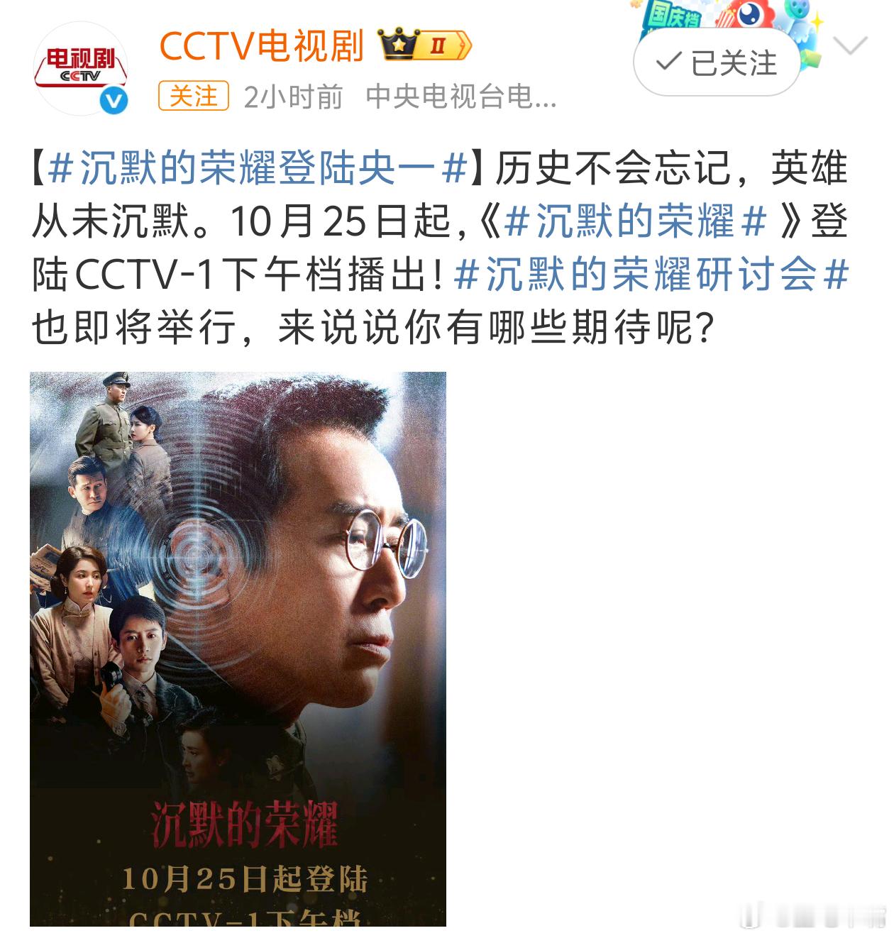 沉默的荣耀研讨会cctv电视剧认证“《沉默的荣耀》即将举办研讨会”!太期待了吧!同时《沉默的荣耀》今天下午也要登陆央一播出![鼓掌][鼓掌][鼓掌]