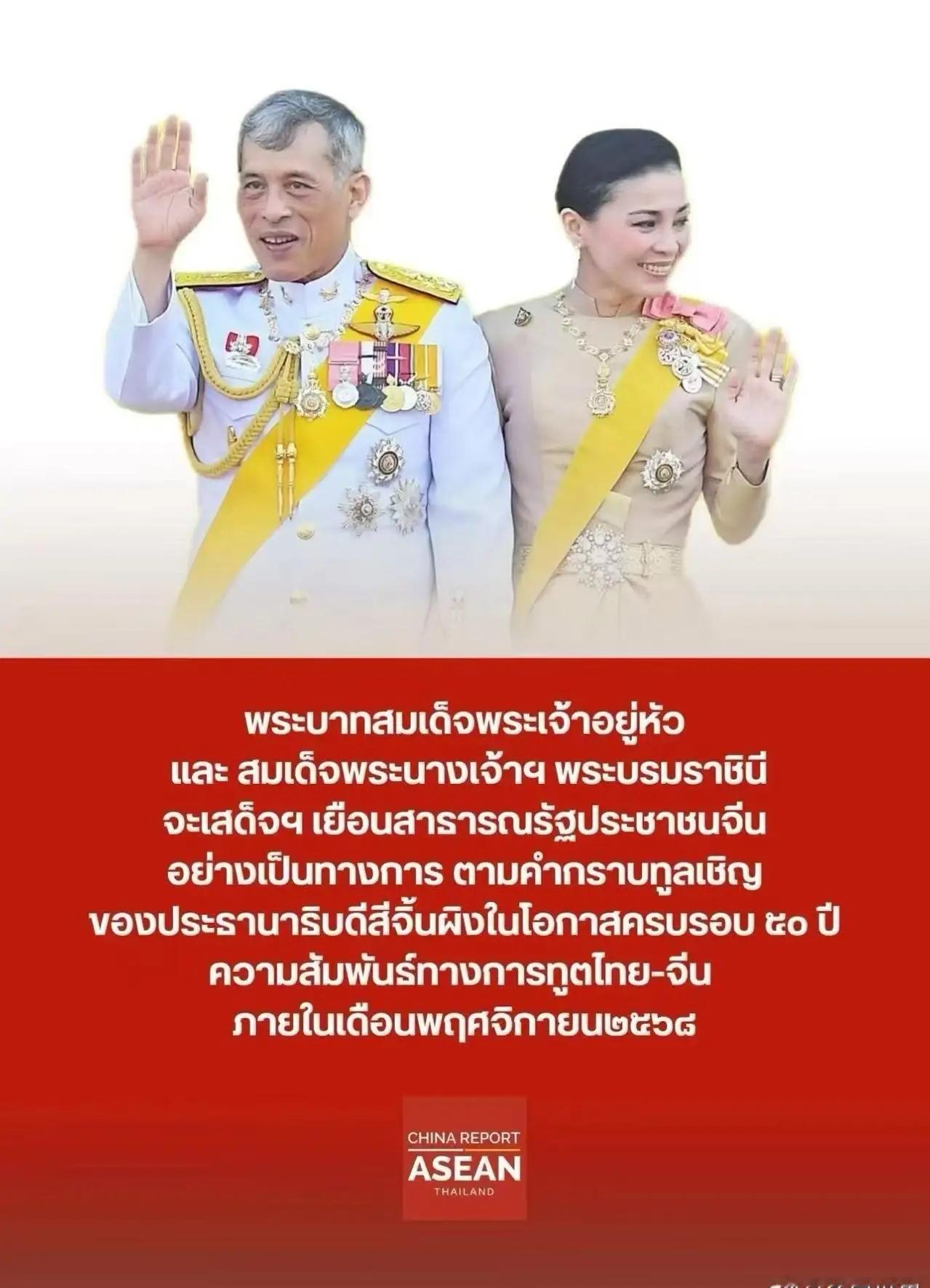 泰国宫务处正式发布公告,玛哈·哇集拉隆功国王陛下与素提达王后陛下将于11月应邀对中华人民共和国进行国事访问。 网友表示:有朋自远方来 不亦乐乎,泰国是我们的邻居,泰国的华人也很多,祝两国友谊长存。把我们的朋友搞得多多的,我们未来会有更多的贸易伙伴和更大的市场[赞] 泰王从他爹那辈起就很少出访,仅有几次也是去同样是君主国的国家出席王室活动,这次是破例了 泰国政府是很狡猾的。二战时期,泰国是一个。唯一没有被卷入战争的国家。 大家怎么看?