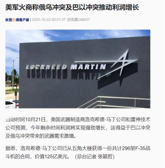 美国两大军火商正式宣布!   2025年10月22日,洛克希德·马丁和雷神技术公司公布了最新财报,两国冲突还在继续,两家公司预计接下来几个季度收入会增加,洛克希德刚拿到五角大楼125亿美元的订单,准备再生产296架F-35战机,雷神今年前三个季度利润比去年同期上升了15%,他们提供给乌克兰的武器占了六成,以色列采购的导弹有一半是他们生产的。   先看洛克希德·马丁这边。F-35战机项目是这家公司的核心业务。这次五角大楼的125亿美元订单,是洛克希德·马丁的一笔大生意。F-35战机是美国及其盟友的主力战斗机,技术先进,用途广泛。   不过洛克希德·马丁在F-35项目上也遇到了一些问题。比如,软件升级延迟导致交付推迟。之前因为软件改进的问题,交付工作被耽误了好几个月,国防部还扣留了每架飞机高达500万美元的最终付款。   而且中国对稀土的出口管制也对洛克希德·马丁造成了影响。稀土是生产F-35战机传感器和导弹制导系统的关键材料,中国供应全球大部分稀土,管制措施让洛克希德·马丁的供应链受到冲击,生产成本上升。   再来说雷神技术公司,雷神在导弹生产方面表现突出。他们提供给乌克兰的武器占了六成,其中包括AIM-120“先进中程空空导弹”等。   这些导弹在乌克兰战场上发挥了重要作用。AIM-120D导弹经过特殊修改,射程可达160至180公里,能够在不进入敌方防空区的情况下击中俄罗斯飞机。   此外雷神还为以色列生产了大量导弹,以色列采购的导弹有一半来自雷神。比如,以色列空军使用的空对地导弹很多就是雷神的产品。   而在国际市场上洛克希德·马丁和雷神都有不少订单,德国计划再向洛克希德·马丁增购15架F-35战斗机,采购费用约为25亿欧元。德国此前已经订购了35架该型号战斗机,首批预计2027年交付。   雷神则在欧洲有新的生产线,德国、荷兰、西班牙和罗马尼亚等欧洲国家正在推动“欧洲天空之盾倡议”,采购“爱国者”GEM-T型导弹,雷神与欧洲导弹集团合资的科姆洛格公司正在德国建设新的生产线,生产这种导弹。   不过两家公司也面临一些挑战,洛克希德·马丁的F-35项目交付延迟问题还没有完全解决,稀土供应的不确定性也影响着生产。雷神虽然在导弹生产上订单充足,但国际市场的竞争也很激烈。   而且俄乌冲突和巴以冲突的持续,虽然带来了订单,但也让两家公司面临一定的舆论压力。   总体来看,洛克希德·马丁和雷神技术公司在2025年的财报表现不错,订单充足,利润增长。但他们也需要应对各种挑战,才能保持这种良好的发展态势。   来源:央视新闻 【美军火商称俄乌冲突及巴以冲突推动利润增长】