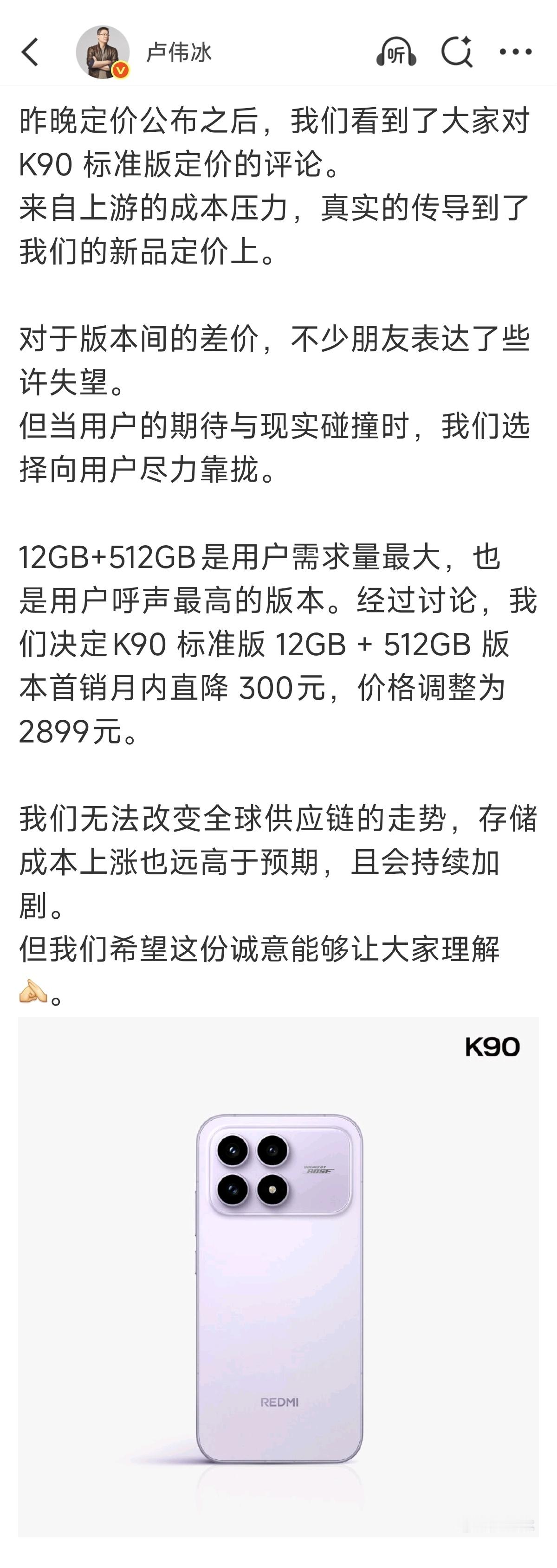 好家伙,这次轮到卢总连夜说服高管了,红米K90标准版首销期间直降300其实昨天