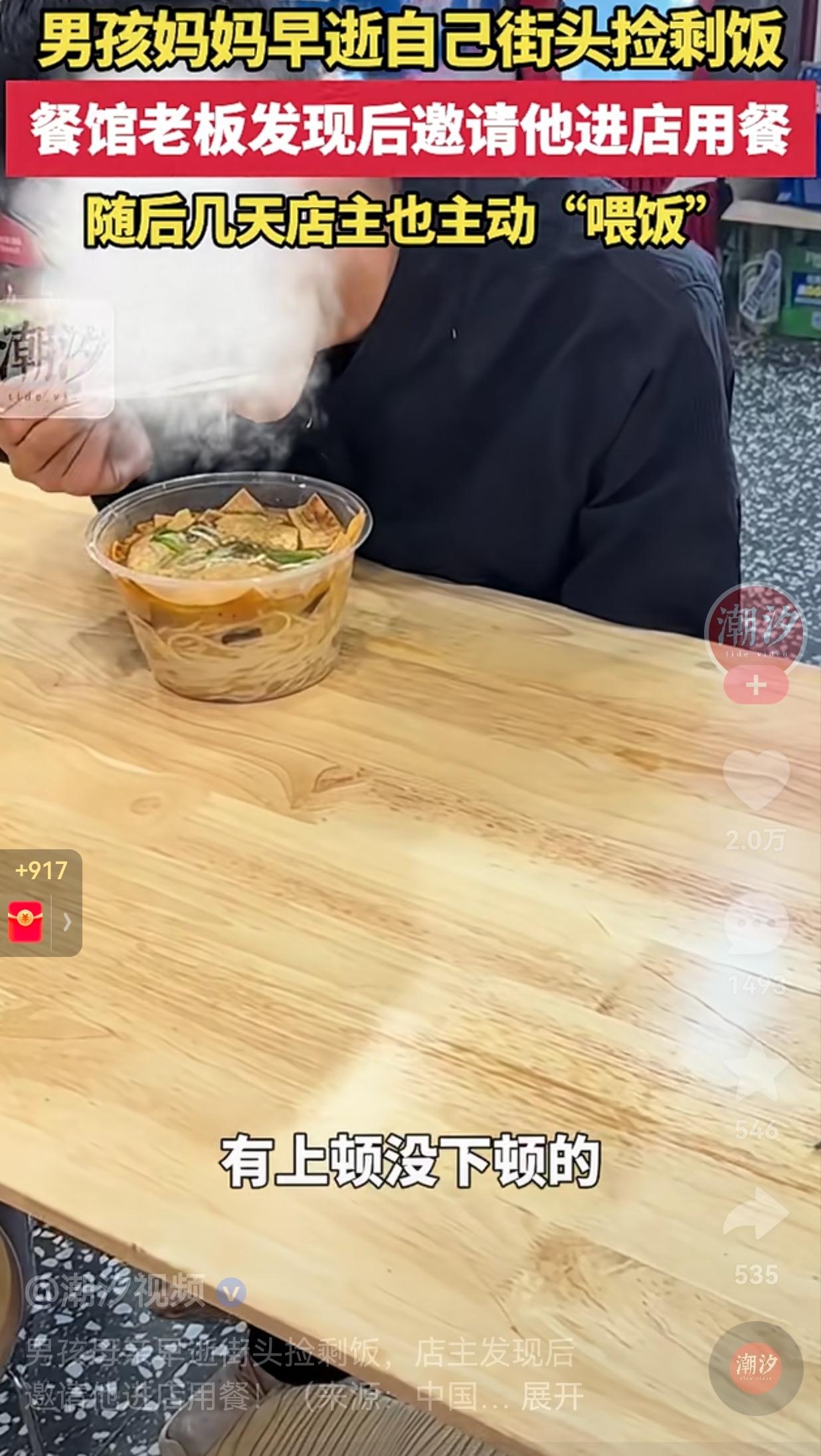 这样的老板活该发财!16岁的男孩因家中变故,母亲因病去世,父亲智力缺陷。 本该无忧无虑的年龄,却不得不承担起家庭的重担。 自从母亲去世候,男孩每天早上坐免费的公交车来到县城,在饭店里捡客人吃下的剩饭。 一天,男孩看到一家饭店有剩饭他就鼓起勇气,询问店主,他能不能吃碗里的剩饭。 老板看他一个小男孩可怜,无依无靠的,就邀请他进店用餐。 男孩第一次感受到来自陌生人的温暖,有点害羞,也有点不知所措。但还是老板的带领下进入了店里。 老板给他准备了一碗螺蛳粉,并询问原因,这才得知男孩家中的情况。 为了彻底改变男孩的情况,老板询问:“你要不要找份工作呀!” 听到男孩肯定的回答,老板还贴心地帮他问问,能不能给他找份工作干?这样一来,男孩的一日三餐就不成问题了。 当然,男孩也很懂事,吃完饭以后,自己拿上桌子上的纸,将桌子擦干净。 随后的几天,老板几次邀请他进店,和他们一起吃饭。 网友看到后评论说,给他找点活吧!让他可以自力更生,不行就留在你们那吧?不给钱也行,给他免费吃住,。们善良,可以教孩子,等他大点了再自己选择。 还有的网友说,很难想象要是他的妈妈知道他的儿子没饭吃该有多难过?祝愿这个孩子以后能够越来越好,也希望有附近的好心人能帮帮他,帮他度过眼前的难关。 男孩的生活虽然很难,但是,他却遇到了善良的老板,老板不仅给他提供免费的午餐,还要给他介绍工作。这样的老板怎么可能不发财呢? 当然了,我相信男孩的窘迫只是暂时的,虽然未来的生活十分艰难,但是,只要你坚持不懈,努力奋斗。未来一定会越来越好的,加油!