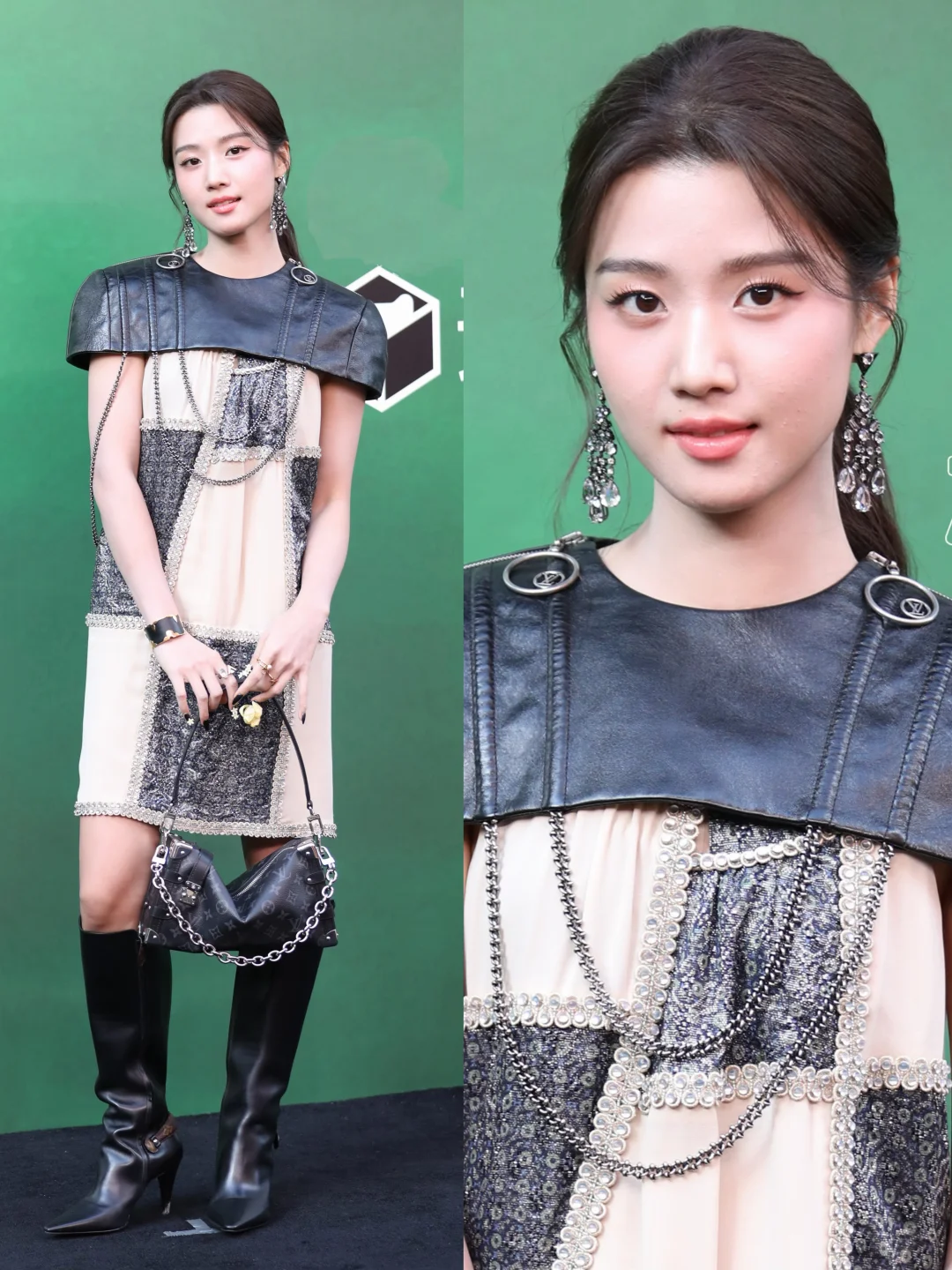 宋妍霏印花超短裙搭配黑色长靴,尽显修长圆润柔美腿部线条!