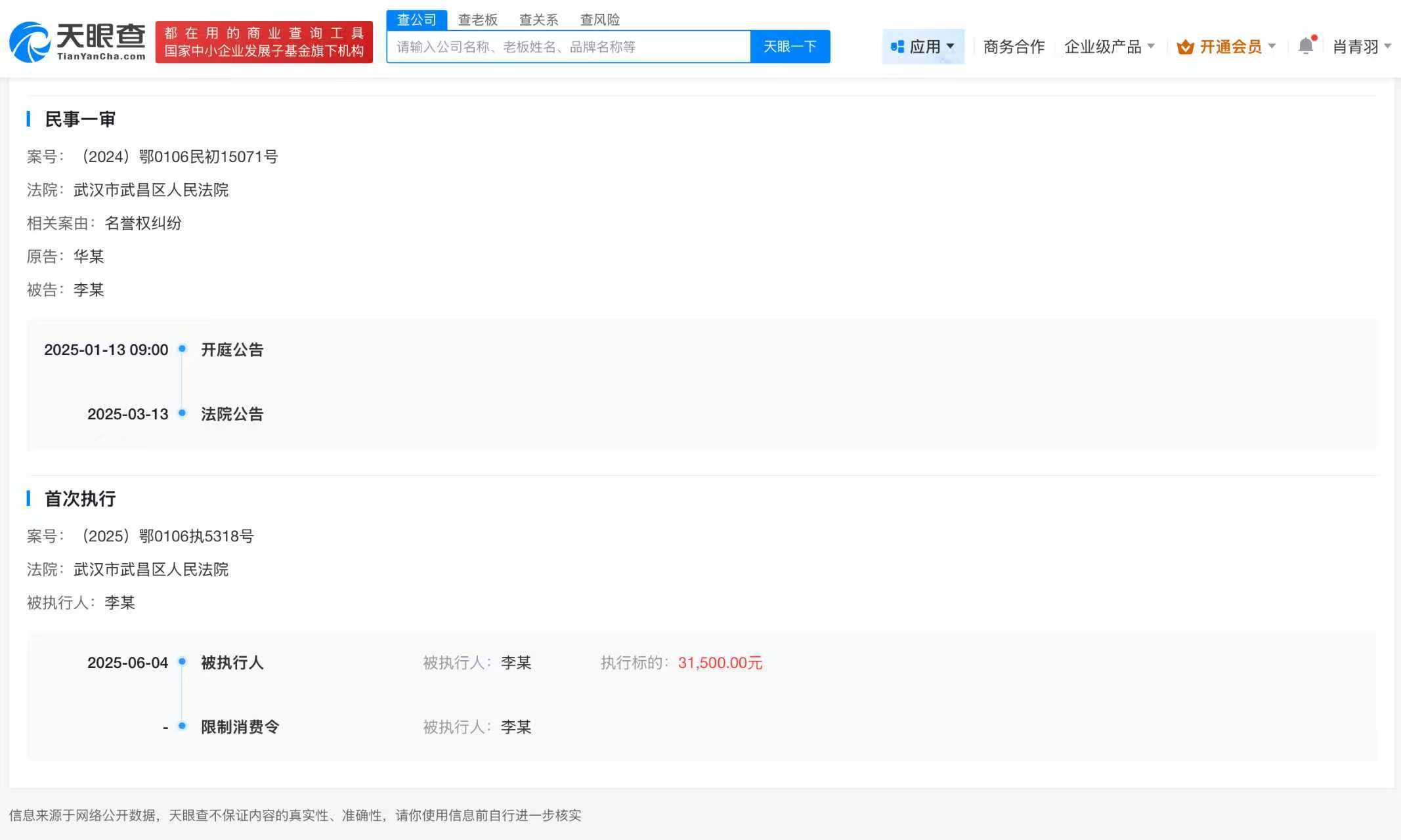 天眼查App显示,近日,因未按指定期间履行生效法律文书确定的给付义务,李某被限制高消费,涉及与华晨宇相关名誉权纠纷一案。此前,李某已因此案被执行3.15万元。