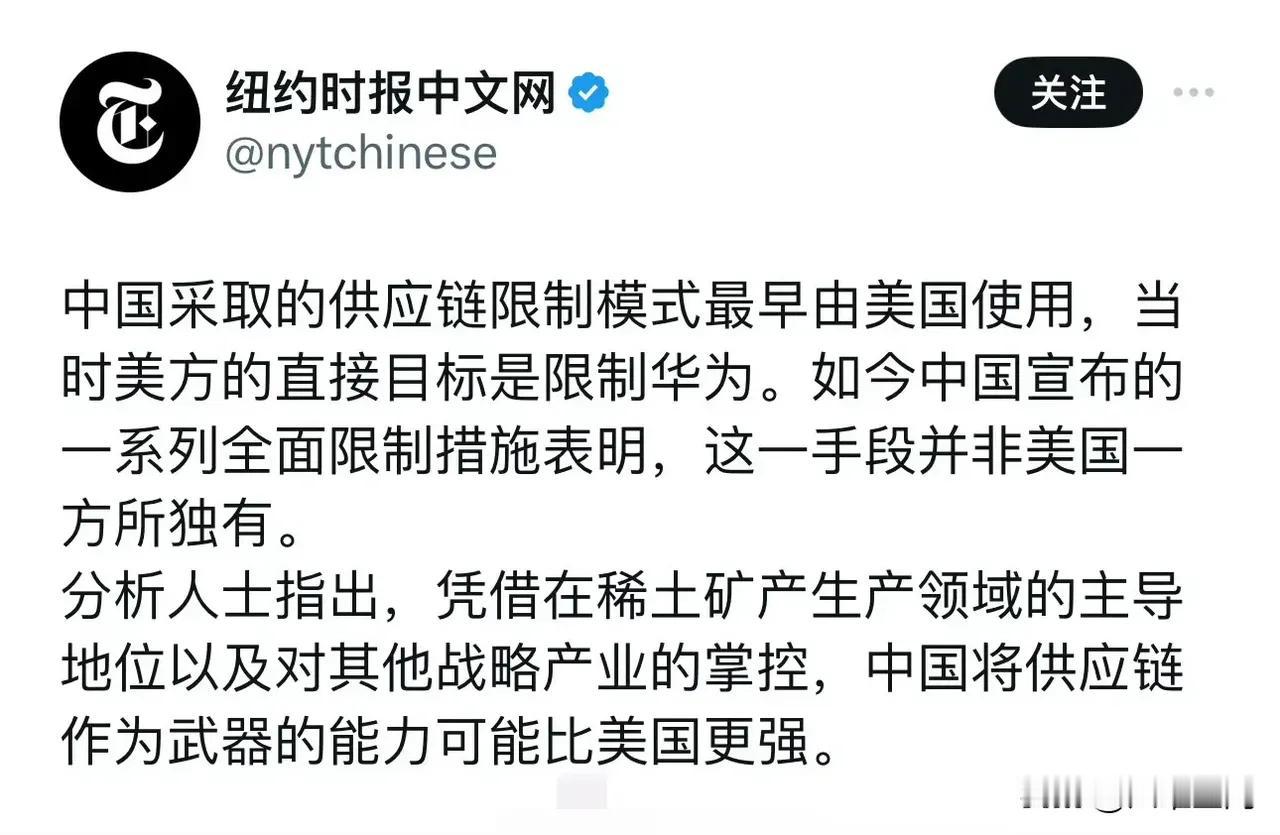 美国人太不长记性,中国人玩“以彼之道还施彼身”这招已经很多次了,他们还是没一点长进。 美媒感叹中国对稀土的管制是学美国对半导体的管制,是对华为的制裁。中国只是学这么点么?日本人把冲之鸟礁填充成岛,中国人在联合国抗议,西方人支持日本,中国抗议无效,从此,中国人吹填岛礁的速度,让西方人崩溃。 中国人在联合国提议,不要把无人设备军事化,西方国家不同意,率先把无人装备军事化,从此,中国的无人装备开始跨代际的领先,机器狗之后是机器狼,就问他们怕不怕。 中国人做事儿从来都是先礼后兵,有理有利有节,你做初一,我才做十五,依托于完备的供应链,依托于我们的全球市场,不断迭代,足够我们后发先至,所以,奉劝美西方,别玩套路,真诚点,我们还是好朋友。
