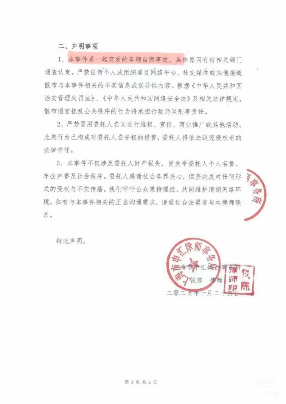 并且这个声明还说了:本事件系一起突发的车辆自燃事故,相关原因有待相关部门调查认定。