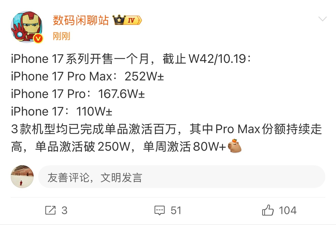 开卖一个月,iPhone17系列激活量已经500万+了。
