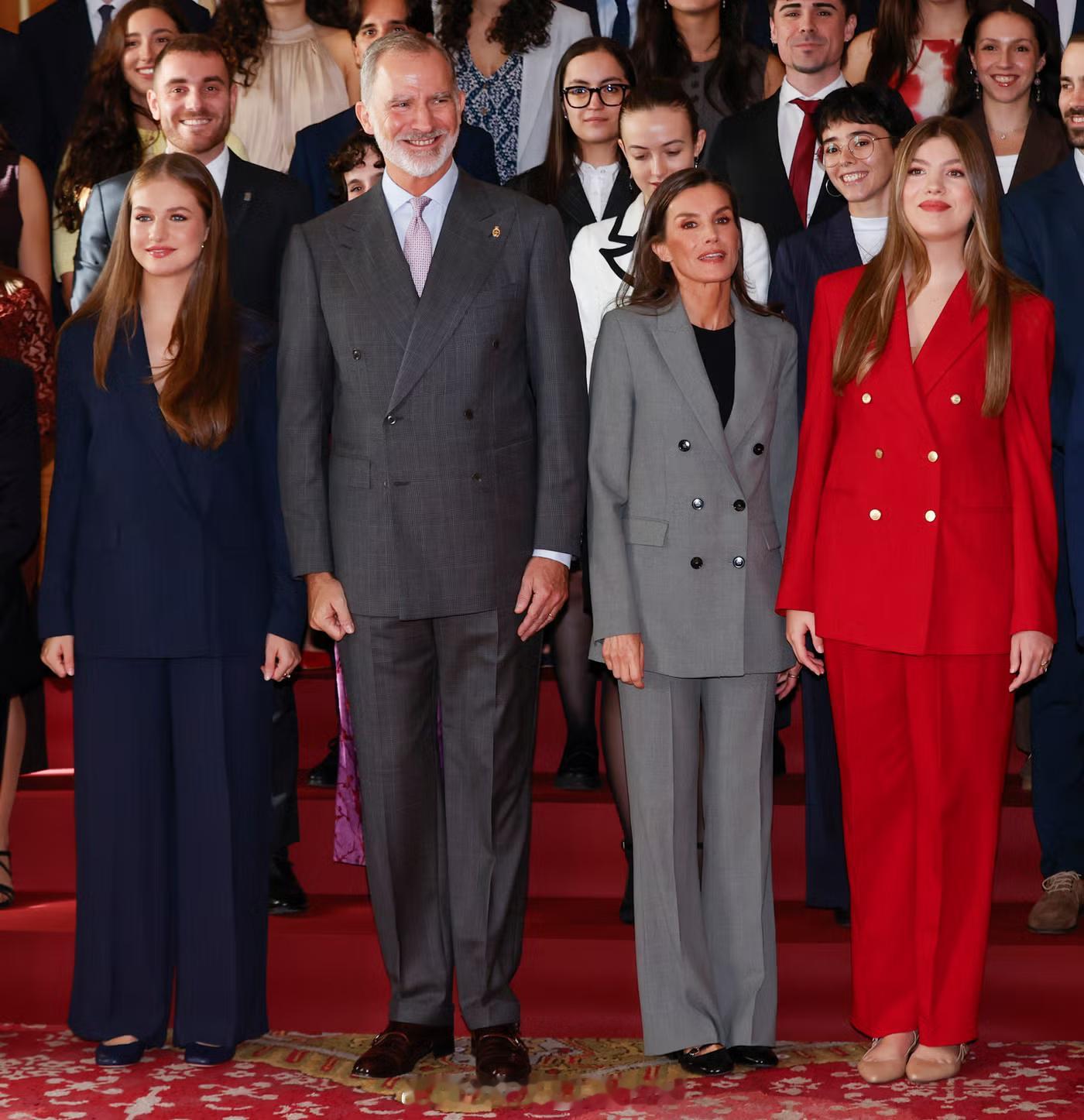这次是西装F4,莱昂诺尔公主穿了在纳瓦拉时穿过的Hugo Boss海军蓝西装(),佩戴了妈妈的耳环();莱后的来自Mango,已经穿过N次了;索菲亚公主的红色西装来自Tommy Hilfiger,增添了一抹亮色~