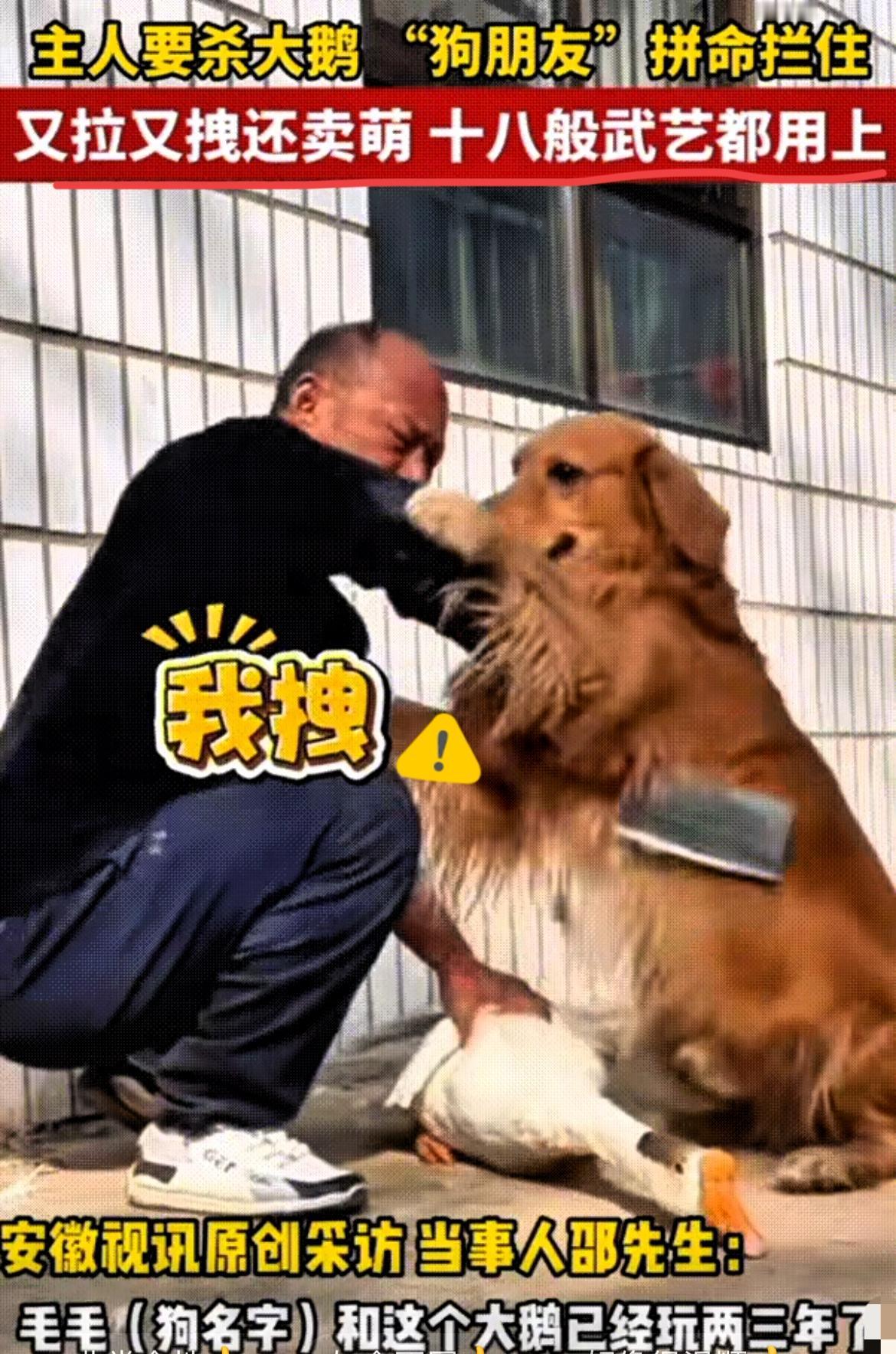 主人举着刀要杀大鹅,旁边的狗子急得直蹦,一口咬住主人的裤腿往后拽,尾巴夹得紧紧的,喉咙里发出呜呜的撒娇声,见硬拉没用,又凑上去舔主人的手背,湿漉漉的眼睛盯着人看,那委屈劲儿,像是在说“别杀它呀”。 谁能想到,狗子和大鹅处了两三年,竟好得跟兄弟似的?平时追着跑着闹着玩,真到了要分开的时候,比谁都护着。主人被它又拽又舔的,看着俩小家伙挤在一块儿,大鹅缩着脖子躲在狗子身后,狗子梗着脖子挡在前头,突然就笑了,刀往旁边一扔:“行了行了,不杀了,留着给你作伴!” 其实哪有什么跨越种族的爱情,不过是朝夕相处的情分。动物的世界多简单啊,喜欢就凑一起,护着就拼尽全力,不像人总琢磨太多。它们不懂什么大道理,只知道“在一起舒服,就不想分开”。 你说,咱们是不是有时候把关系搞得太复杂了?要是都像狗子这样,喜欢就护着,不喜欢就躲开,会不会活得更痛快?