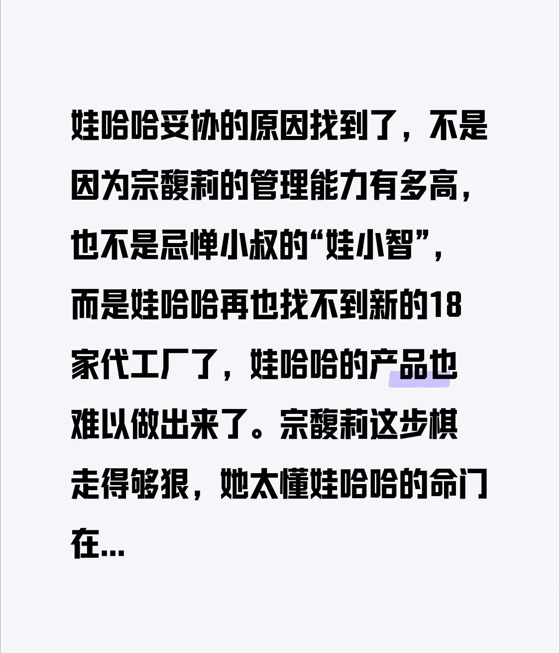 娃哈哈妥协的原因找到了, 不是因为宗馥莉的管理能力有多高, 也不是忌惮小叔的“娃小智”, 而是娃哈哈再也找不到新的18家代工厂了,娃哈哈的产品也难以做出来了。 宗馥莉这步棋走得够狠,她太懂娃哈哈的命门在哪——代工厂和经销商就是企业的手脚,没了它们,再大的牌子也转不动。她敢辞职,敢放手,说白了就是吃准了这点:你不按我的来,供应链先给你撂挑子。 小叔的“娃小智”?说穿了就是被架在火上烤。以为对手离场就能捡漏,却没算透老品牌的根基不在花架子上,在那些实实在在的生产线和渠道里。最后发现,自己忙活半天,不过是替别人的决策当了回背景板。 其实啊,企业这点事儿,跟过日子一样,表面看是争权夺利,骨子里拼的还是家底厚不厚、软肋护得牢不牢。宗馥莉的果敢,从来不是靠冲动,是把对方的七寸摸得门儿清。 你们觉得,要是代工厂没卡脖子,这场博弈的结局会不一样吗?