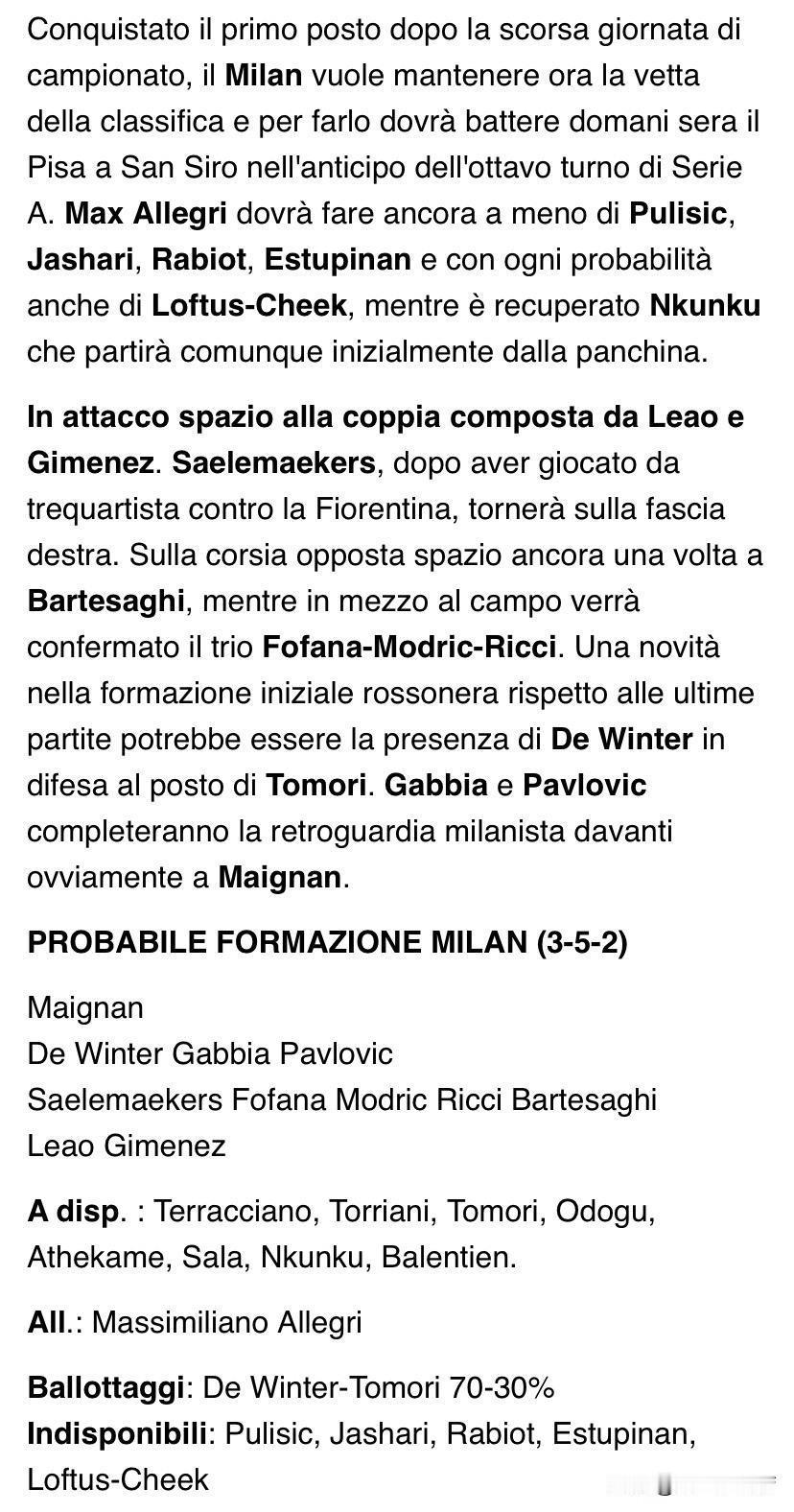 米兰与比萨之战首发阵容!首发阵容与我们想象的只有一个变化,德温特替代托莫里成为主力右中卫,托莫里替补原因非伤病原因。个人觉得德温特首发靠谱,托莫里在右边跟萨勒马克尔斯两个人的高空能力都不行,德温特替了托莫里,这边的高空球应该能改进不少,其实在对手没有速度型边锋的时候,德温特在后防线比托莫里有意义,当然只是个人想法。 米兰首发阵容:352 门将:迈尼昂 后卫:德温特、加比亚、帕夫洛维奇 中场:萨勒马克尔斯、里奇、莫德里奇、福法纳、巴特萨吉 锋线:希门尼斯、莱奥 奇克与埃斯图皮尼安缺席本场比赛,他们不会出现在米兰的替补席。埃斯图皮尼安脚踝依然不适,奇克还是肌肉疲劳,我不理解,奇克都休息一周了,为啥还疲劳,这个肌肉疲劳是吃饭造成的,还是睡觉造成的?
