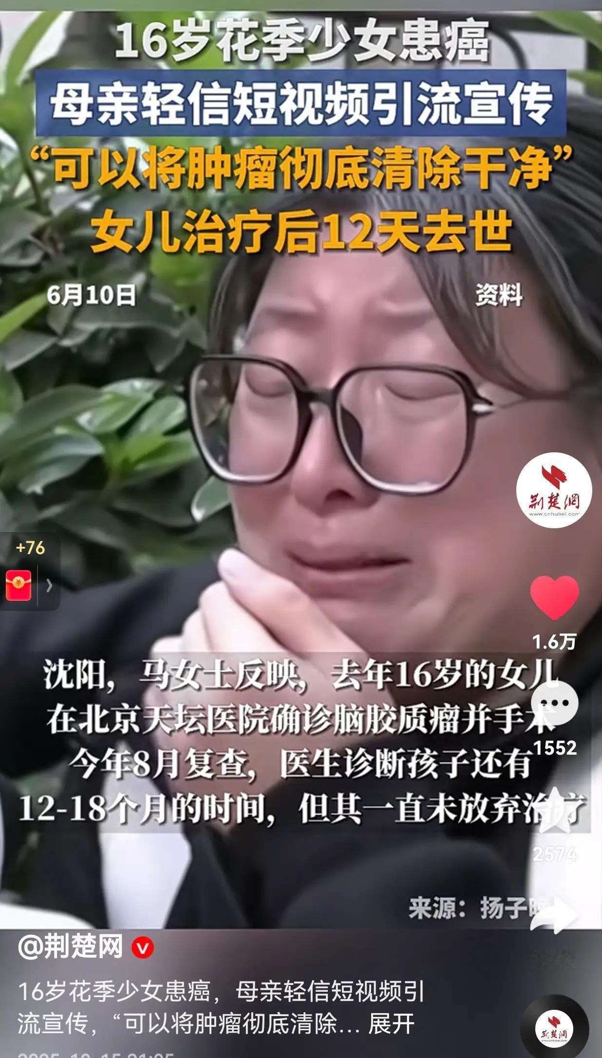 花季女孩治疗12天后去世,短视频诊疗引流不能没底线 就在这个春意盎然的季节里,一个花季少女的生命悄然离去,令人扼腕叹息。她才16岁,正值人生最美好的年华,却在短短12天的治疗中,走向了生命的终点。这个令人心碎的故事,再次敲响了社会的警钟:网络时代的医疗“引流”,到底还能不能有底线? 我们都知道,互联网改变了信息的传播方式,也让医疗变得更加便捷。然而,便利的背后,却隐藏着无数隐患。那些为了吸引眼球、追求流量的短视频、直播带货、虚假广告,正在逐渐侵蚀着公众对医疗的信任。有人说,谁都希望快点找到“偏方”或“神药”,但却忽略了,生命没有“快进键”。 这起少女的悲剧,或许只是冰山一角。背后隐藏的,是一些医疗机构和个人为了“引流”不择手段的“底线失守”。他们用夸张的标题、虚假的宣传,甚至不顾患者的生命安全,拼命制造“爆款”。这样的行为,究竟是商业的无底线,还是道德的缺失? 更令人愤怒的是,很多家长在信息的海洋中迷失了方向,盲目相信网络上的“神医”、“偏方”,把宝贵的生命交给了毫无保障的“线上诊疗”。他们渴望快速解决孩子的疾病,却没有意识到,这种“快餐式”的医疗模式,可能带来无法挽回的后果。 这场悲剧,唤醒了我们每一个人:在追求便利和流量的同时,必须坚守底线,不能让“引流”变成“谋财害命”的工具。我们需要一个更健康、更有责任感的网络医疗环境,也需要每一个家庭和个人擦亮双眼,用理性和责任守护生命的尊严。 生命是无价的,不应成为任何商业炒作的牺牲品。让我们共同呼吁:网络医疗不能越过底线,公众的生命安全才是最重要的底线。希望这起悲剧成为警钟,唤醒更多人对生命的敬畏和对责任的坚守。因为,只有守住底线,才能守护我们最珍贵的生命。手术后死亡 女孩手术死亡