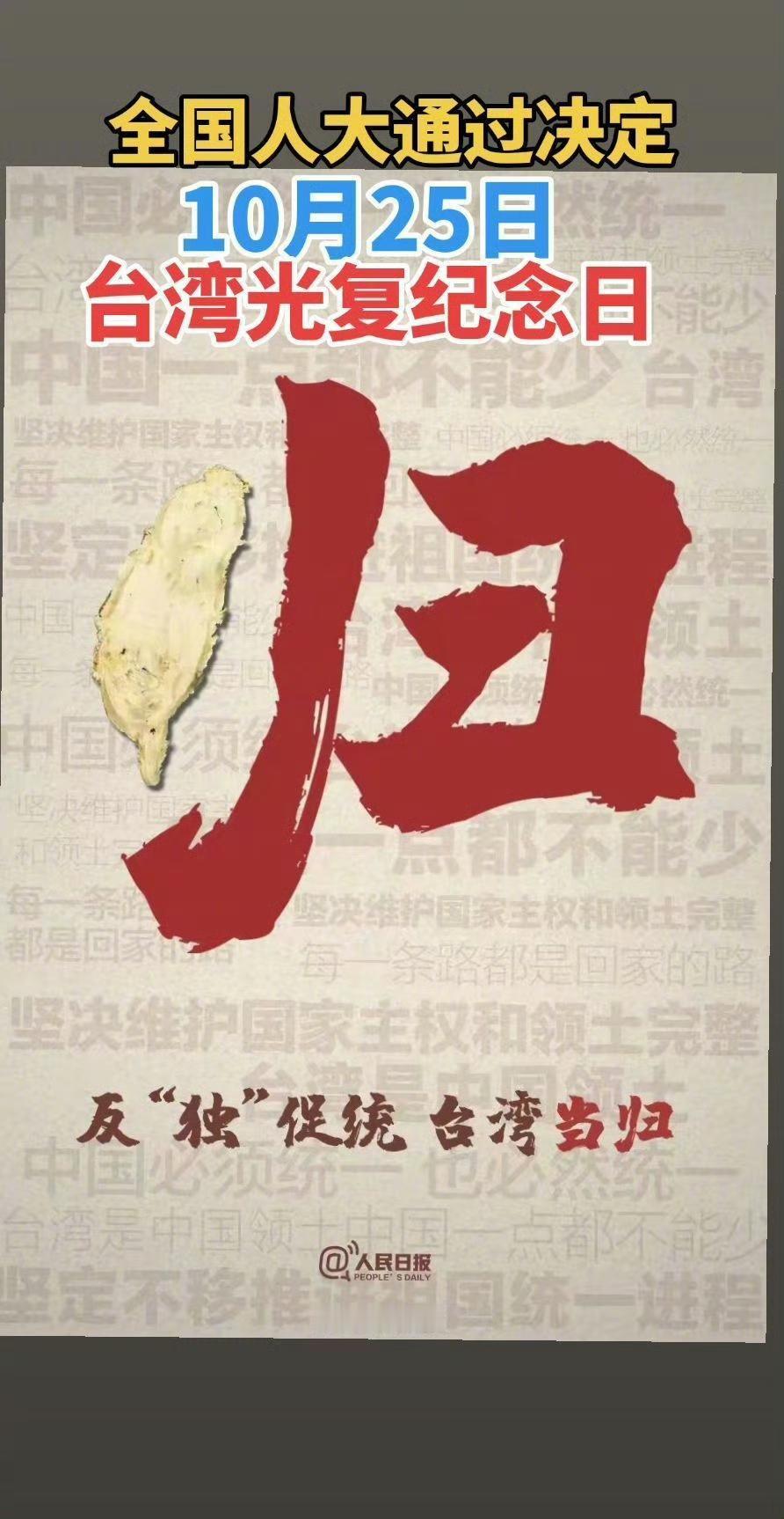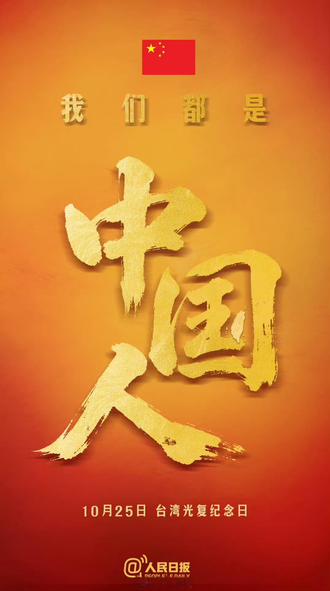 台湾光复纪念日! 10月25日是台湾光复纪念日,1945年10月25日台湾省被收复回来,自此被分离多年的台湾省又回到了祖国的怀抱! 祖国仍然没有实现真正意义上的统一,台湾当归!我们都是中国人! 历史的脚步谁也没有办法阻挡,祖国必将最终完成统一!