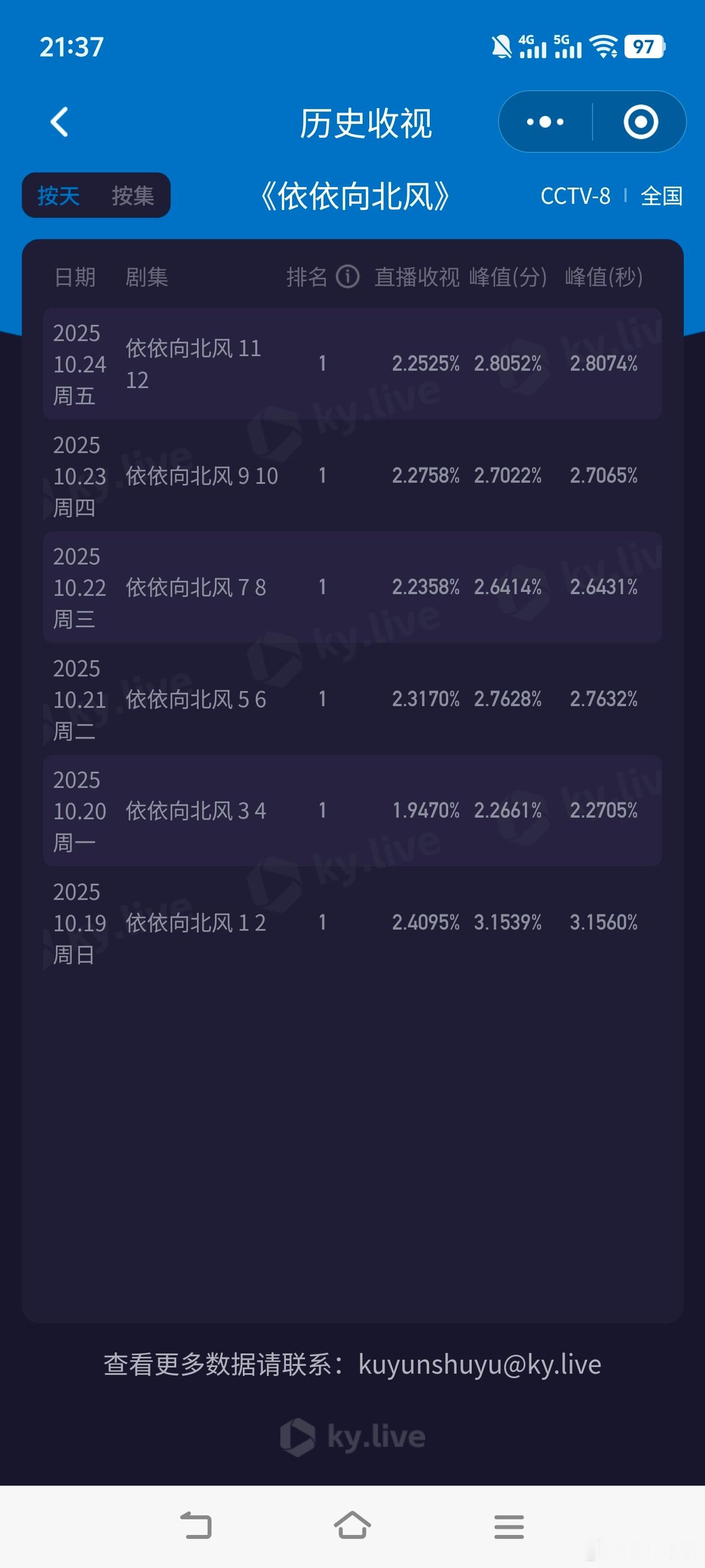 依依向北风周五收视快报!酷云峰值2.8074,仅次于首播日!不过单日平均没涨!稍有遗憾!