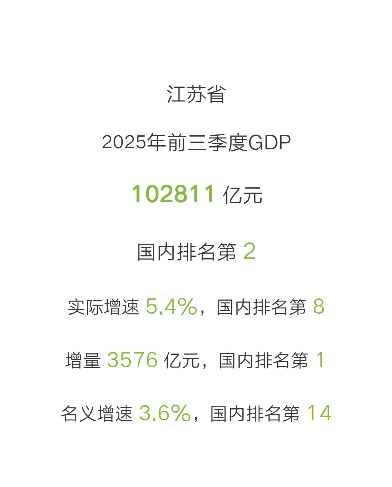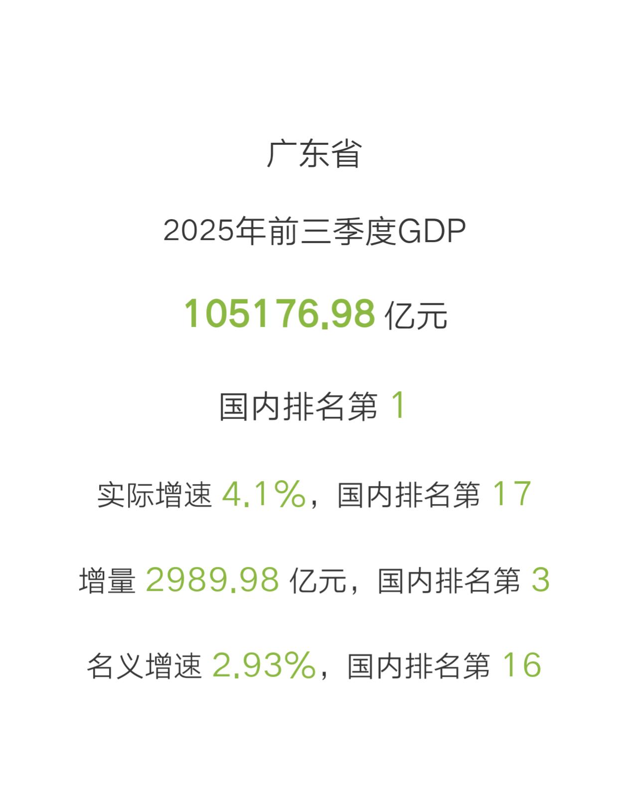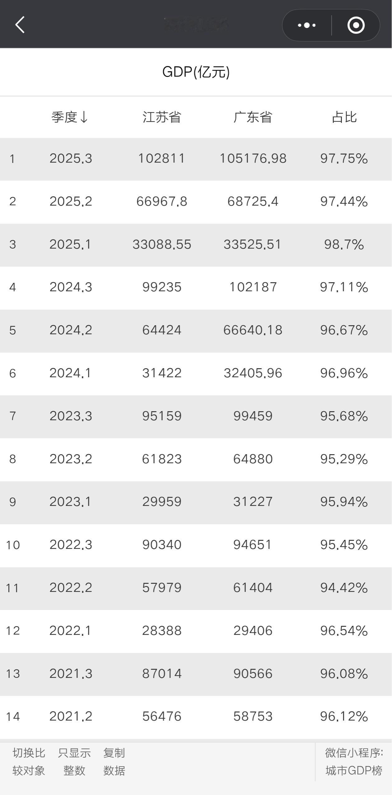江苏正在无限接近广东。广东经济依然拉胯,2025年一季度名义增速3.45%,二季度3.13%,三季度2.93%,逐季下降。接下来就看深圳、广州、佛山、东莞、惠州、珠海、中山谁在拖后腿了。江苏经济超越广东,重回第一,也许只是时间问题。
