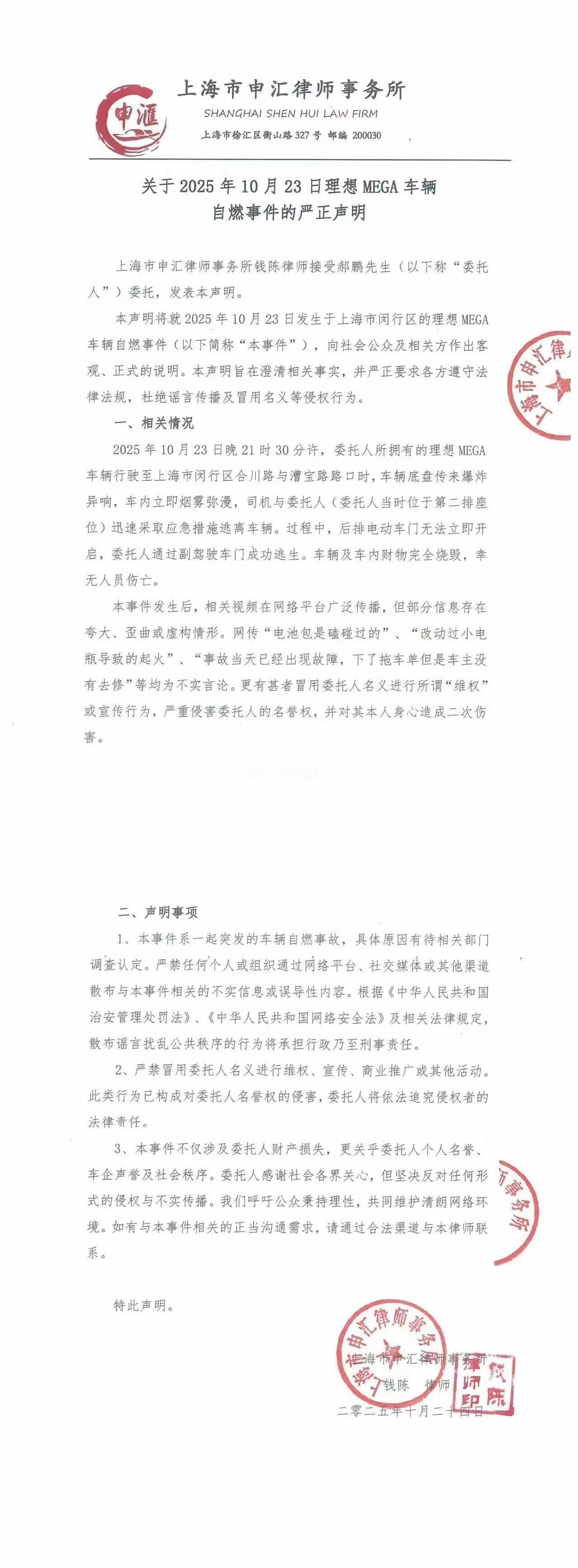 【理想MEGA自燃官方声明后,迎来反转】网传一份盖公章的律师函,其内容显示为车主