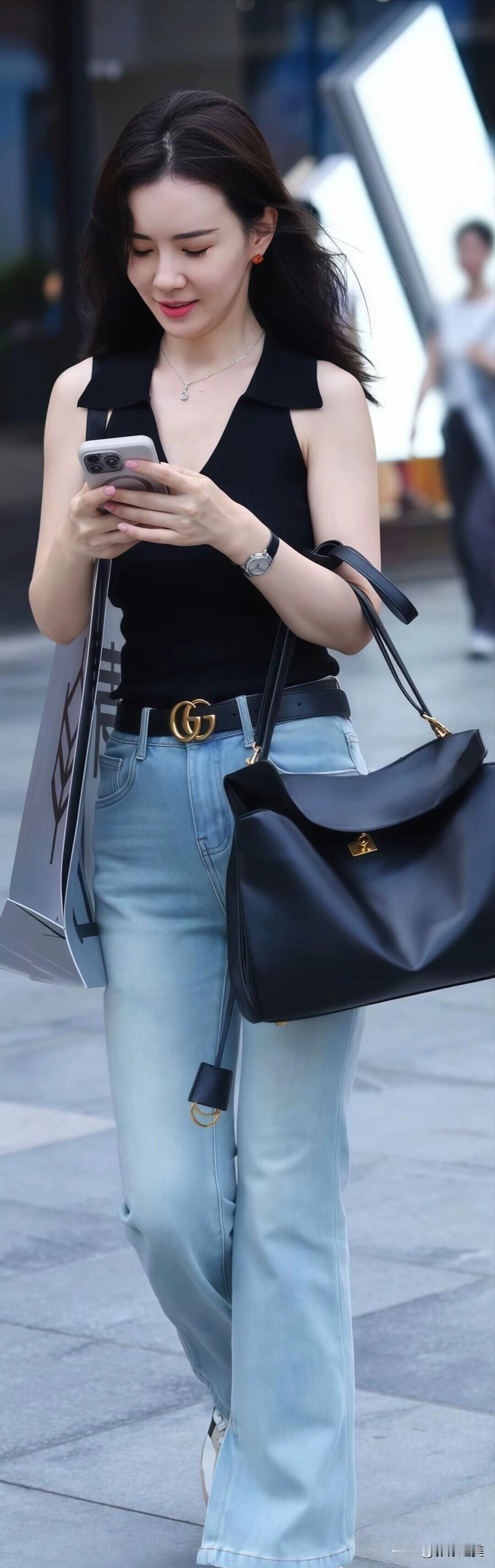黑色无袖上衣搭浅蓝微喇牛仔裤,再配上精致配饰,简约又高级,这穿搭很有品味~