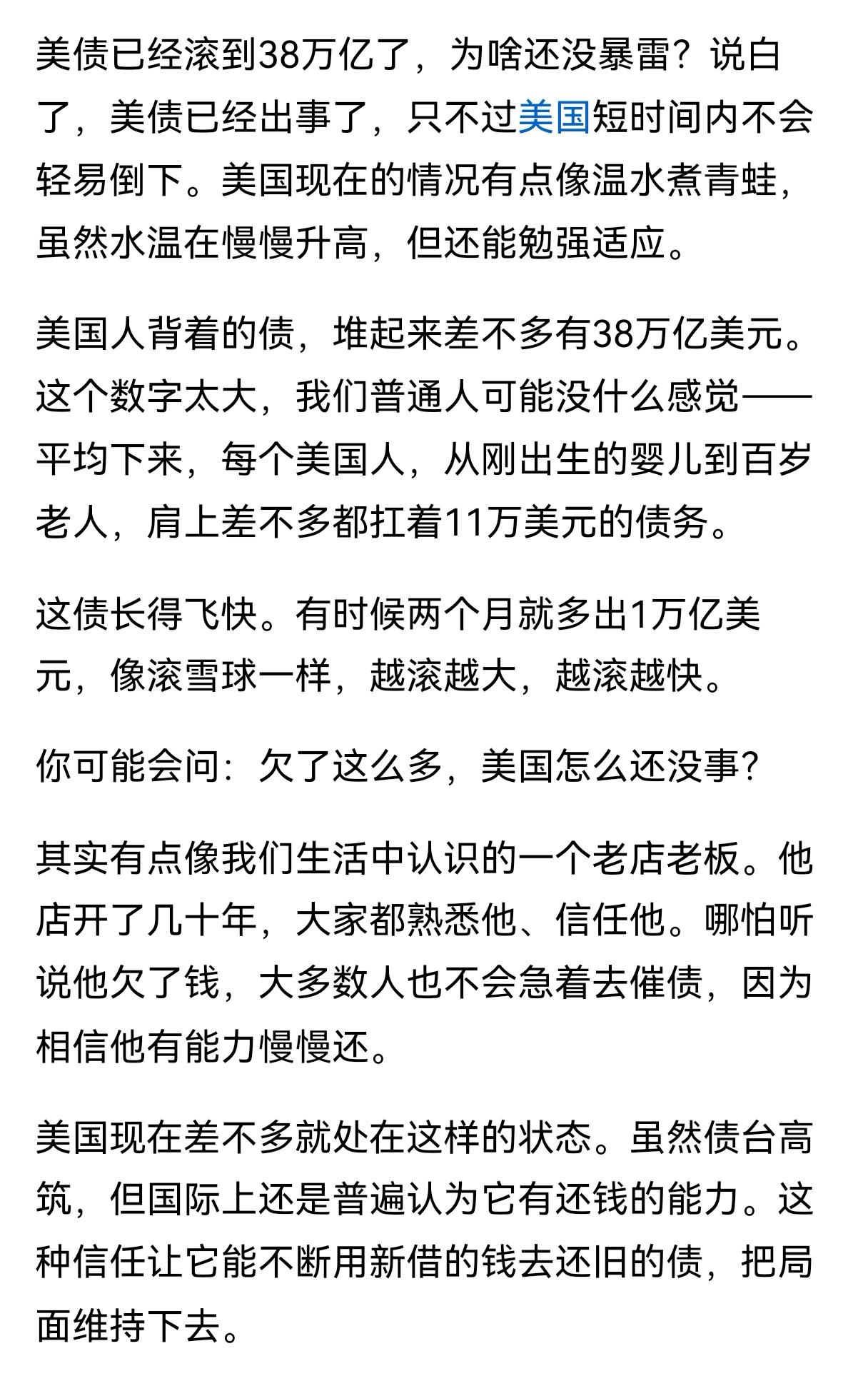 美国人应该不在乎美债了 欠一块是欠,欠38万亿也是欠,反正不打算还,想想还是欠38万亿更爽。钱欠多了,债主都提心吊胆的,欠钱的反而是老大。不出意外,美债还会继续增加,速度还会越来越快,感觉美债也成了美国绑架世界的一个工具。