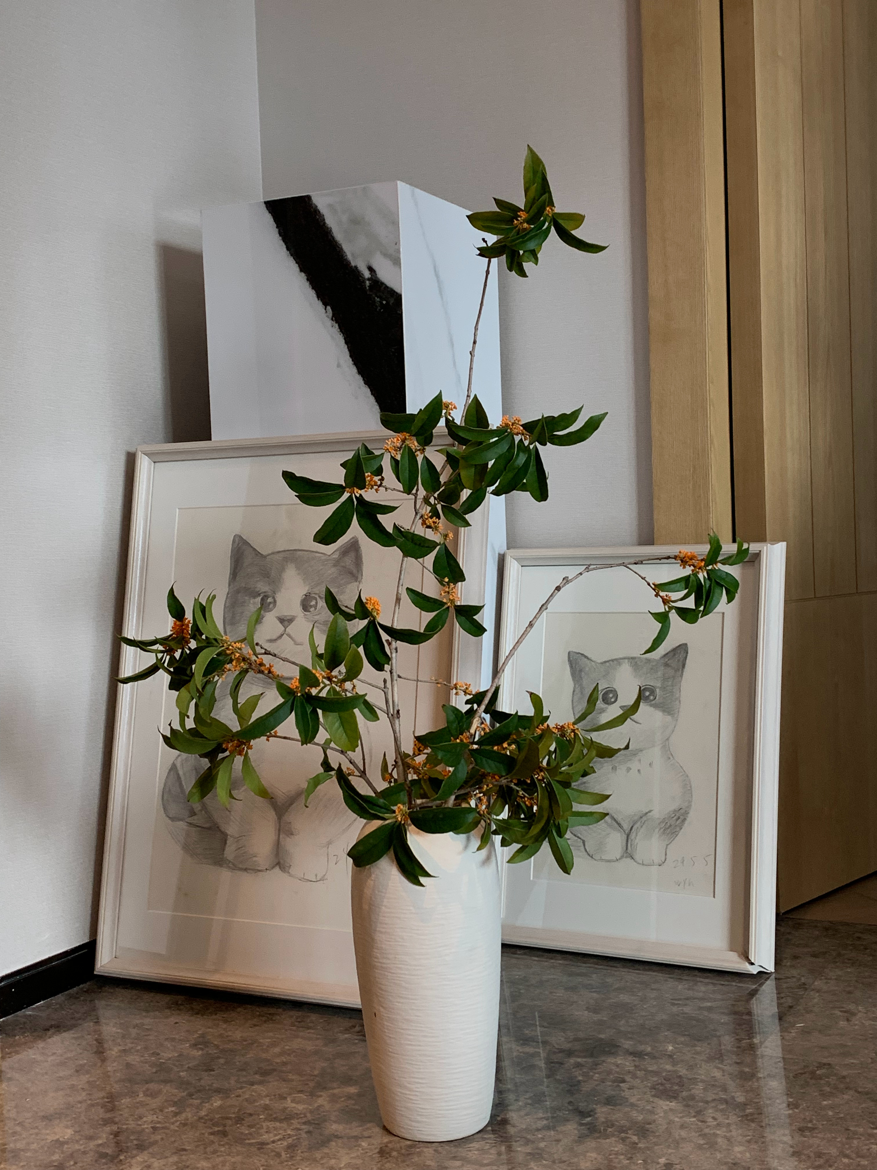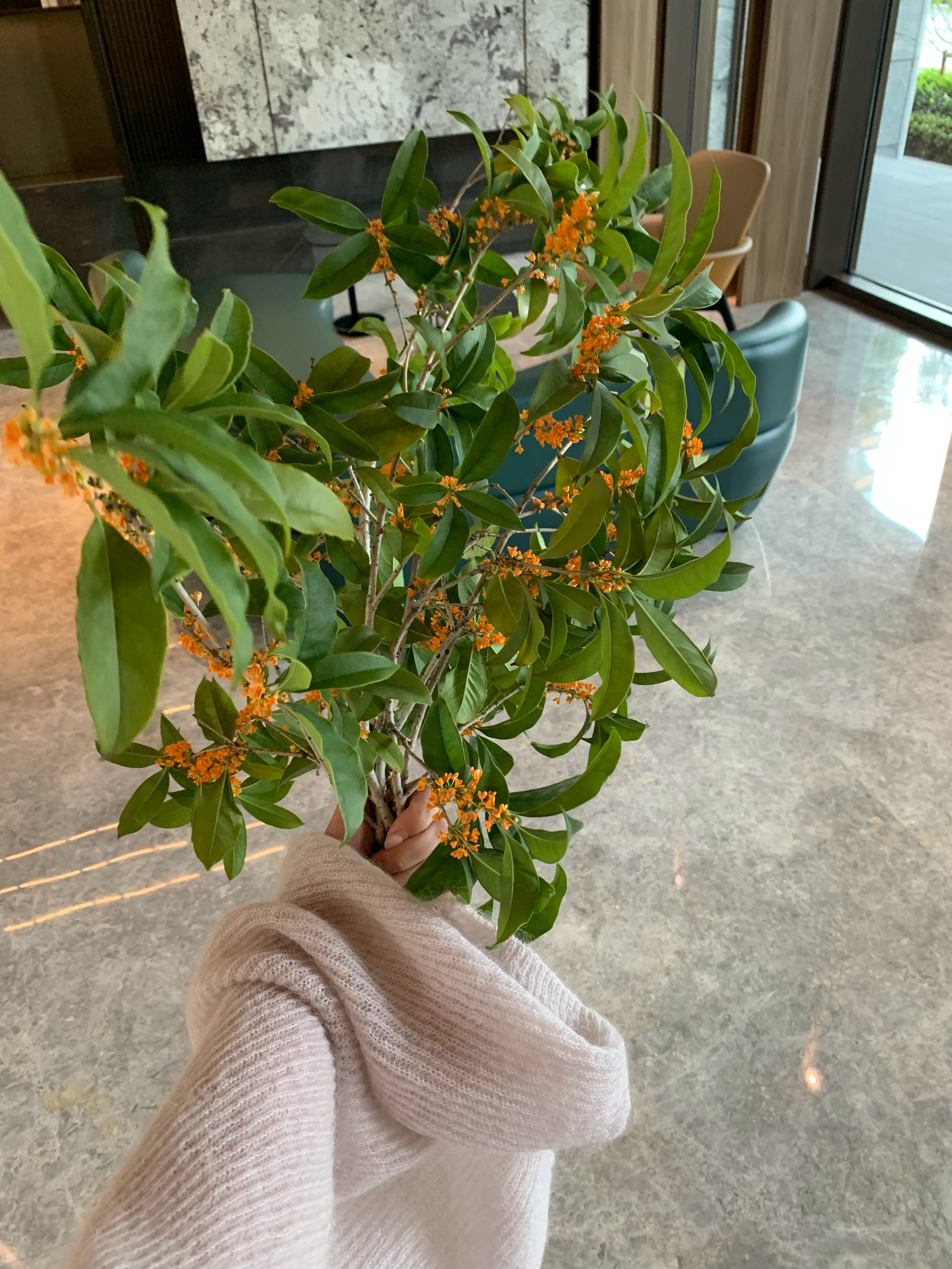 在路边桂花树下吸香气 修剪师傅送了几支桂花[憧憬]