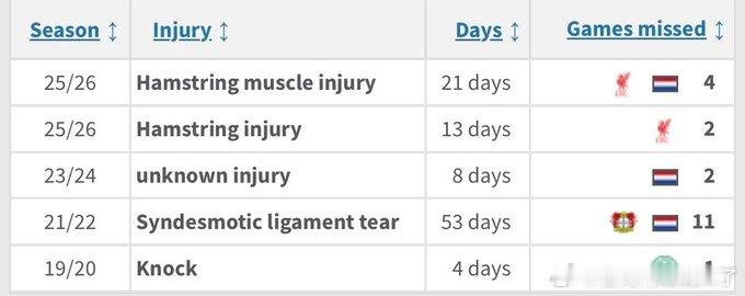 身披利物浦战袍初期就两次遭遇腘绳肌伤病,实在令人扼腕。