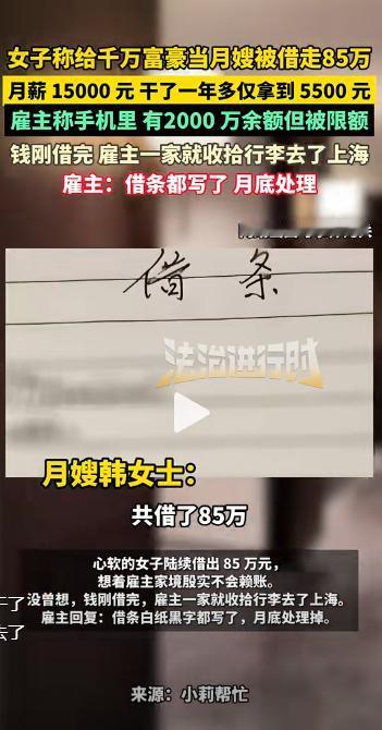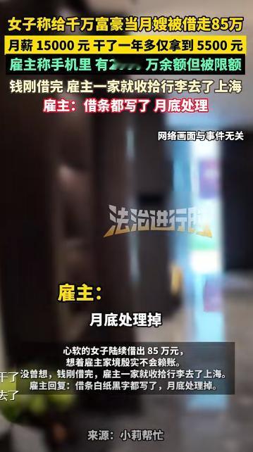 浙江湖州,女子给千万富豪当月嫂,月薪15000元,她还以为遇到了大雇主,结果,她干了1年多,却只收到5500元工资,不仅工资没收到,还反被雇主借走85万,雇主一个劲解释:卡上有2000多万被限额!取不出来,让女子帮帮忙!不料,借完钱后雇主一家就跑上海去了!     韩大姐(化名)学的月嫂对于照顾孕妇以及小宝宝简直就是手拿把掐,然而就在近日的时候她的一个朋友给她介绍了一户人家,特别有钱,而且自筹也比之前干的多好几倍。   随后她便来到浙江湖州,为一个自称“千万富豪”的家庭做月嫂,月薪一万五,在月嫂行业几乎是顶级待遇,而且雇主家的别墅装修豪华、家具高档,每一处都在显示工作价值,让她觉得自己赚到了机会。   韩大姐刚去的时候雇主一家态度很好,尤其是负责沟通的“宝奶奶”,总是很客气,让韩大姐彻底放下戒心,可干了很长一段时间了高薪迟迟没到账,一年多过去,她总共只拿到5500元。   情况进一步荒唐起,“宝奶奶”指着自己银行账户上面的两千多万元给韩大姐说不是不想给她发工资,而是这些钱因为银行限额了,所以等再等等。   这个说法明显不合常理,普通银行单日取现超过五万才需要预约,而千万级存款客户更有银行专门服务,不可能被所谓“限额”限制。   但在那套豪华的环境和数字冲击下,韩大姐仍然信以为真,以为只是暂时周转不开,没有意识到自己被陷入了骗局。   她对“好工作”的信念让她忽略了明显的漏洞,也让雇主利用她的信任展开更深一步的操作,这件事展示了,即便看到巨额数字,如果缺乏判断和警惕,也可能被表象蒙蔽,陷入现实的陷阱中。   更令人震惊的事情发生了,本该发工资的雇主,反而开始向韩大姐借钱,要不就说周转资金需要钱,要不就说手头继续用一点,反正每次在说之前都会用所谓的“两千万”来作为信誉。   就这样韩大姐整整借给了他们八十五万元,韩大姐从普通打工人,变成了替雇主“输血”的债主,这种权力关系完全颠倒,也是骗局最核心的地方。   谁知钱借完之后,雇主一家悄悄搬到上海,只留下冷冰冰一句“没钱了”,韩大姐打催债电话,才发现自己被骗。随后等警方介入之后,两人就直接写了一个欠条,对方还声称在月底会将钱还完的。   事后这件事情被网友刷到了之后,一些网友在下面评论说,现在这样的人太多了,所以在上班的时候不管多有钱只要不开工资到自己的账户里面就不要迷信。   还有一些网友说,现在骗子的手段越来越高明了,所以在日常生活中一定要多加注意,以防被骗。     那么通过这件事情可以看出韩大姐之所以被套住,不仅是因为那串看得见的2000万数字,更是因为她对高薪工作机会的执念。   她想抓住这个机会,主动忽略了明显漏洞,最终竹篮打水一场空,这种心理,让骗子有了可乘之机,让她一步步陷入陷阱,最终付出惨重代价。   对此,你还有什么看法呢? (信息来源 :法治进行时 )