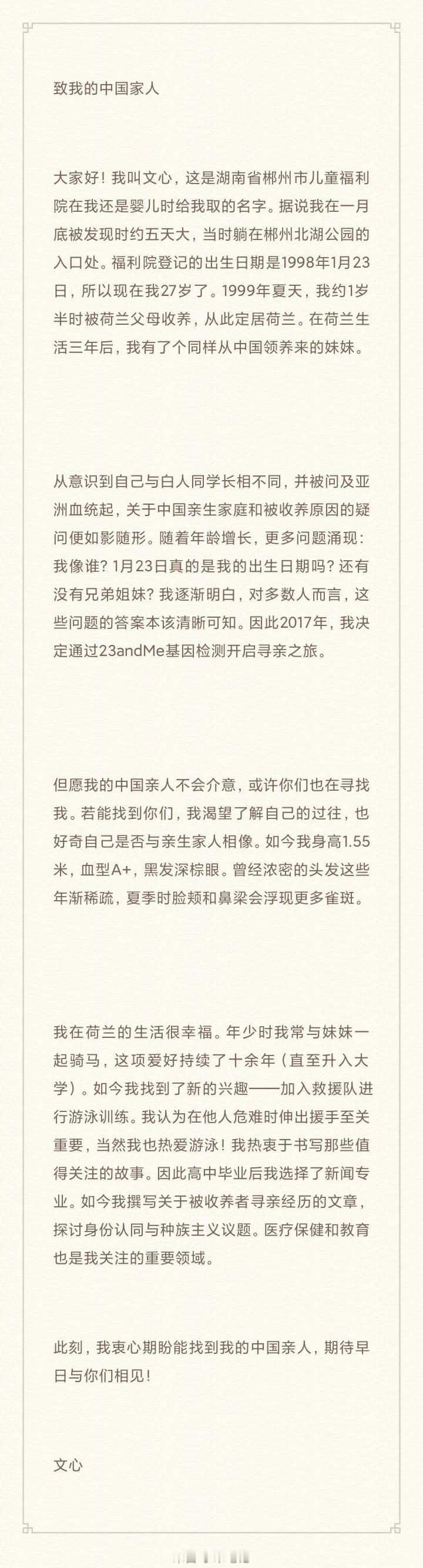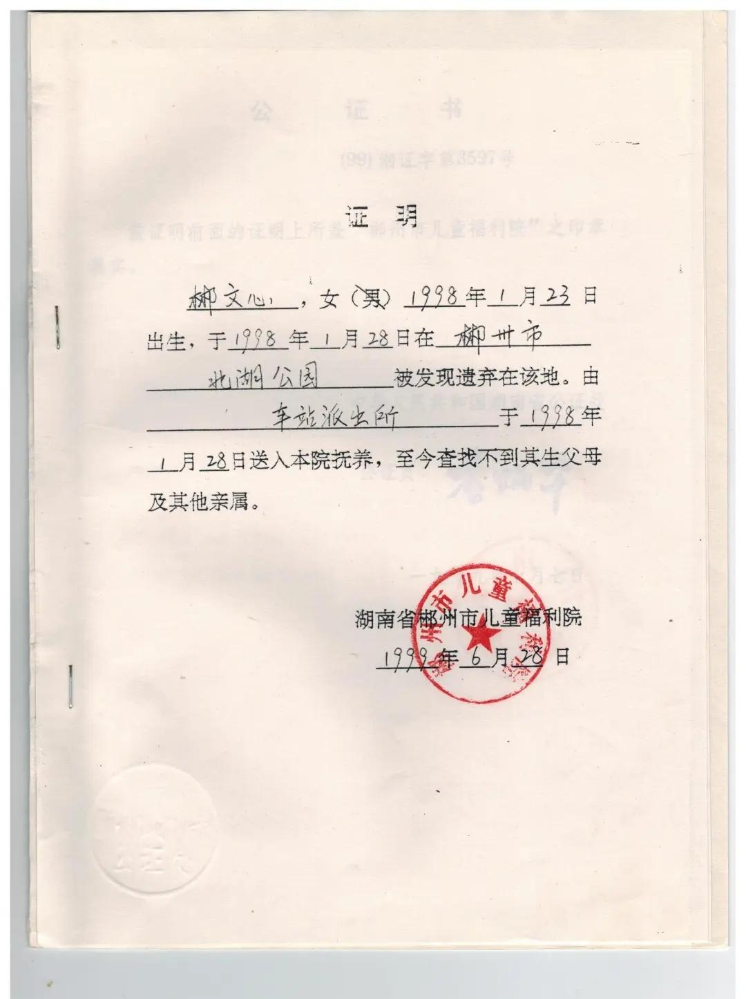 98年出生湖南郴州北湖公园女孩寻亲 大家好,这是一则1998年出生的湖南郴州女孩文心的寻亲信息。如若知情人士能提供相关线索,帮助她寻亲,我们将不胜感激! 1998年1月28日,文心在郴州市北湖公园被唐建军发现,随后她被车站派出所送入郴州市儿童福利院抚养。据推测,她出生在1998年1月23日。 郴文心,是郴州市儿童福利院给她取的名字,寄托着对她的美好祝愿。在福利院工作人员的精心照顾下,她在福利院生活了一年半,于1999年7月被一对海外父母领养。 文心保留了中文名字的拼音作为她现在的名字,她的养父母希望她不要忘记自己的根源。她非常感谢养父母的养育之恩,也好奇国内的亲生父母。她想知道亲生父母长什么样子,如今过得怎么样。她的养父母也十分支持她了解自己的身世。 她计划在十月份回到中国,回到郴州,希望能了解更多自己的身世和感受中国文化。 如果您生活在郴州及其附近,欢迎转发扩散,帮助文心早日联系上自己的亲生家庭!如果您身边有和文心长得像的人,也欢迎转发扩散!同时,如果您有任何关于发现人唐建军的信息,文心都会非常感激!谢谢!寻人 寻亲