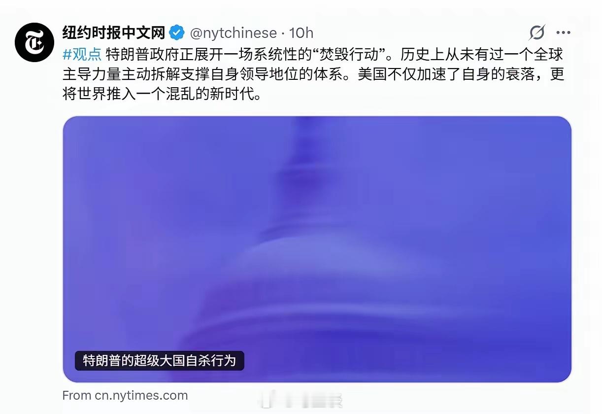 纽约时报称特朗普的战鹰行为是“超级大国自杀行为”。该报的中文网是不是外包给谁了?哈哈明明懂王是让美国再次“伟大”,白左媒体玻璃心碎一地~我看川普就挺好,贡献了我将近十年的乐子,已经成为我生命的一部分~😂😂😂