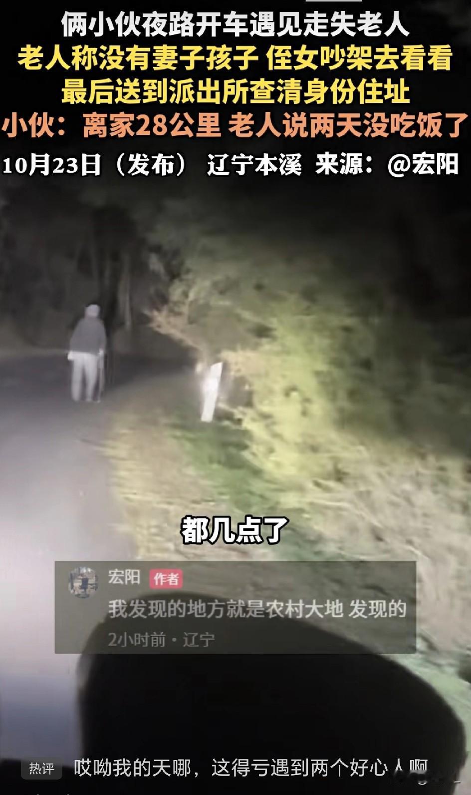 寒夜中,两小伙“捡”到一位迷路老人:步履蹒跚,已离家28公里,自称两天没吃饭! 10月23日,辽宁本溪。两名小伙子开夜车的路上,周边都是农村的土地,发现了一名步履蹒跚的老人。 小伙子停车问老人是不是找不到家了?老人说不上自己的名字,但知道自己得过脑梗,说自己没有老伴,也没有孩子。自己是要去侄女家,因为侄女和侄女女婿干仗了,自己得去看看。 两个小伙子赶紧让老人上车,载着老人去了附近的派出所,查到了老人的家庭住址,发现老人居然走路离家已经28公里了,老人说自己两天没吃饭了。 10月下旬的辽宁,晚上的温度已经到了零下,白天的高温也不过10度出头,而这位老人居然已经走了两天了。 幸亏遇到了两位热心的小伙子,把老人“捡”到了派出所。不然,在这样的寒夜会发生什么,谁都不敢深想。 网友们纷纷点赞两位热心的小伙子的同时,也有不少人说,把这个视频传出去,给那些号称“不婚不育”的男女们看看。 虽然不是所有的不婚不育都是自己主动选择的,但是一个人老年以后的孤独和无助也是现实问题。 虽然社会有各种政策去保障老人们的晚年,但毕竟不如家人在身边的陪伴和照顾。 更有网友说,只要老人不讹人,社会上还是有很多的热心人愿意帮助老年人的。 记得公公在世时,因为患阿尔兹海默症,有一次住大伯哥家时,半夜自己打开房门走出去了。 房门是特意反锁的,就怕万一晚上睡着了,老人自己跑出去。结果还是没挡住。公公半夜跑出去了,嘴里一直嘟囔着要回家,回他自己的家。 幸亏遇到了巡夜的民警,也幸亏给他手腕上戴了一个手环,上面清清楚楚刻着儿子们的名字和电话。 当时,公公已经走出了5里地开外。 当民警的电话打给大伯哥的时候,他们还浑然不知老父亲已经走出去好几个小时了。 当时,记得也是秋冬季节,真的特别后怕,万一遇不到警察,万一路上出点什么事,后悔药哪里去找? 现在老年人的比例越来越高,社会在往老龄化发展,如何让每一个老人都能安享晚年,确实是一个迫在眉睫的事情。 我们都有老去的那一天,父母的今天就是我们的明天,如何安放他们的晚年,是我们的责任,也是我们提前布局自己的未来。 愿天下的老人,都能老有所依,老有所养,老有所乐,老有所安! 信息来源于洛阳网,侵联删!