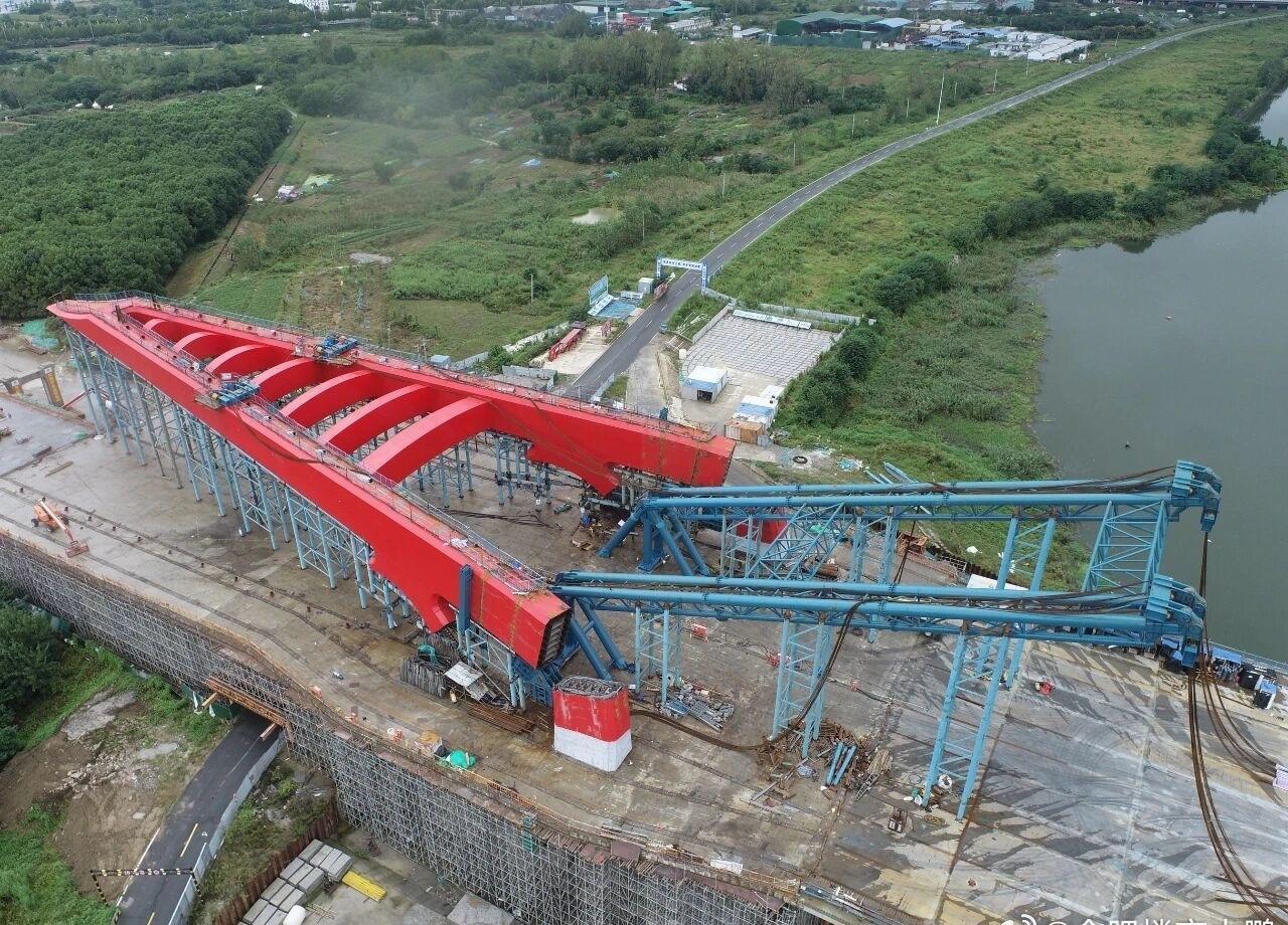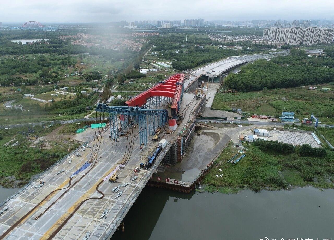 截止目前,主桥主塔竖转系统安装与调试工作全面铺开,项目整体工程量已完成88%,正向结构封顶的关键节点稳步推进。 龙岗路跨南淝河特大桥,是安徽省内首座竖向转体桥梁,也是目前国内跨度最大、桥宽最宽的市政转体桥梁。主塔高达115米、跨度达170米,桥宽55.6米,集设计难度、施工强度、创新程度于一体,刷新多项行业纪录。 目前,项目整体进展顺利,计划年内实现主桥贯通。届时,这座“跨河巨构”不仅将极大提升片区通行效率,更将以其恢弘的造型与技术突破,成为合肥城市建设新地标。