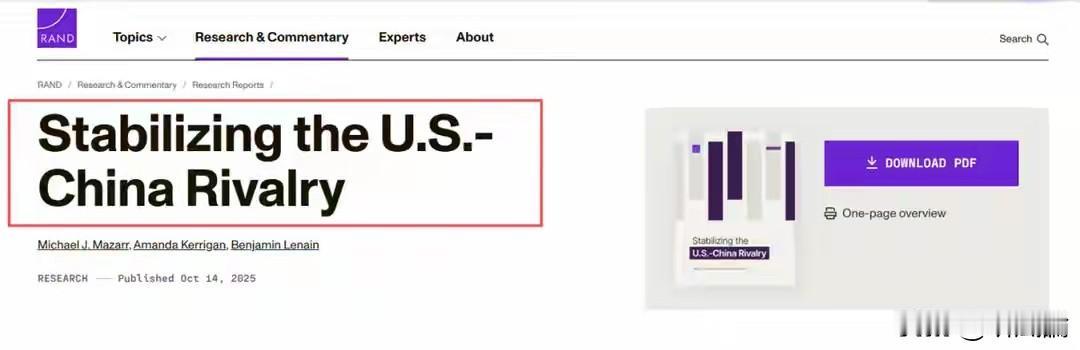 近日(2025年),美国兰德公司发咧一份115页的报告,叫《稳定中美竞争》。这家公司虽不是官办,但常年拿美国政府和军方的钱,说话有分量。报告核心就一句:美国赢不了中国咧,得换个活法。 为啥现在改口?报告说穿咧——从2008年奥巴马搞“重返亚太”拖到2025年,中国军力经济科技全起来咧,美国再搞零和博弈准栽跟头。兰德劝美国嫑学对付苏联内套,要认怂共存,搞“有限竞争”。 报告点了三个火药桶:科技、南海、台湾。科技争人才抢材料,能谈;南海划红线,能谈;唯独台湾没商量——中国视其为命根子,动不得。兰德咬死:美国得放弃模糊战略,支持中国“渐进和平统一”,只要不动武,就煽风点火鼓励谈。 但这好话怕要落空。2025年美国刚通过《台湾增强威慑法案》,特朗普政府正冒劲,兰德报告大概率被晾一边。不过能放出这话,说明美国明白人开始盘算退路咧,咱心里得有数。 中美关系 中美谁更胜一筹 中美谁更强 中美博弈论 中美合谈 中美政策对比 美国竞争策略