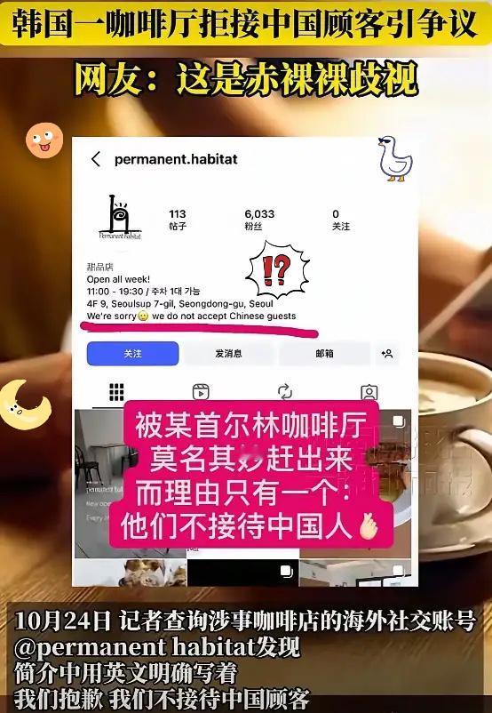 “简直离谱!” 韩国一咖啡厅当场赶走都已经点了咖啡的中国顾客,表示不接待中国人,店铺门口还用英文贴上不招待中国顾客。网友“杀”到店铺评论区后,咖啡店老板回应此事说:虽然从人性的角度上说很遗憾,但这就是我! 真是把忘恩负义写在了脸上。明明靠中国博主打卡才火起来,转头就把“不接待中国人”写进社交账号简介,点完单的顾客都能当场赶走。 最气人的是老板那态度,被问起还嘴硬“虽然遗憾,但这就是我”,合着歧视还成了值得炫耀的个性?做生意最基本的就是尊重,连这都做不到,跟自砸饭碗有啥区别。 要知道韩国不少商场都靠中国游客撑着,之前还有商场因中国客减少倒闭的先例。 一边想赚中国人的钱,一边又搞歧视,这种双标操作谁能忍?网友号召避雷太对了,咱们的钱要花在尊重我们的地方。 这种歧视行为不光砸了自己招牌,还拉低其他韩国商家的好感。你们觉得这种搞国籍歧视的店,最后能有好下场吗?首尔星巴克