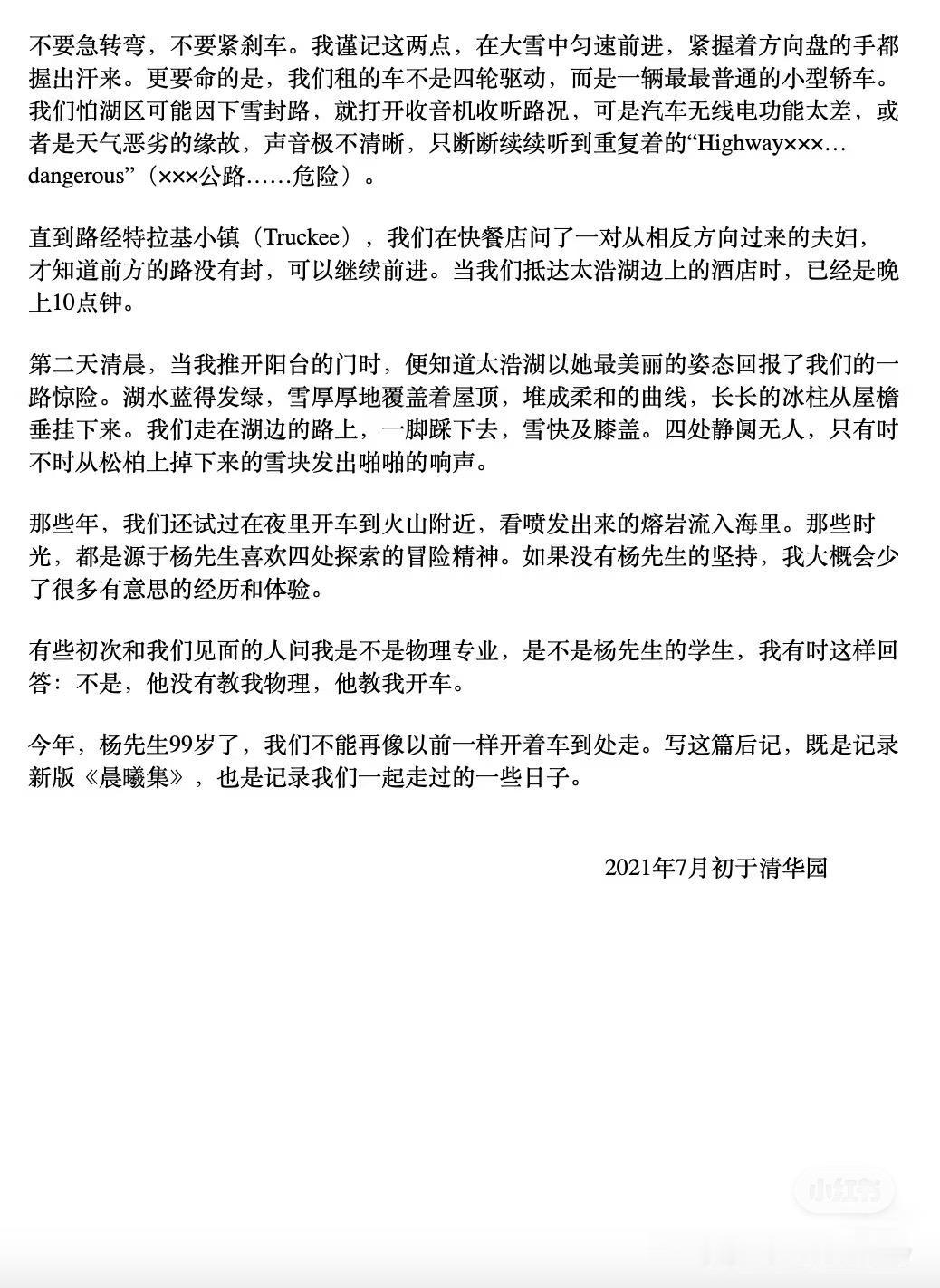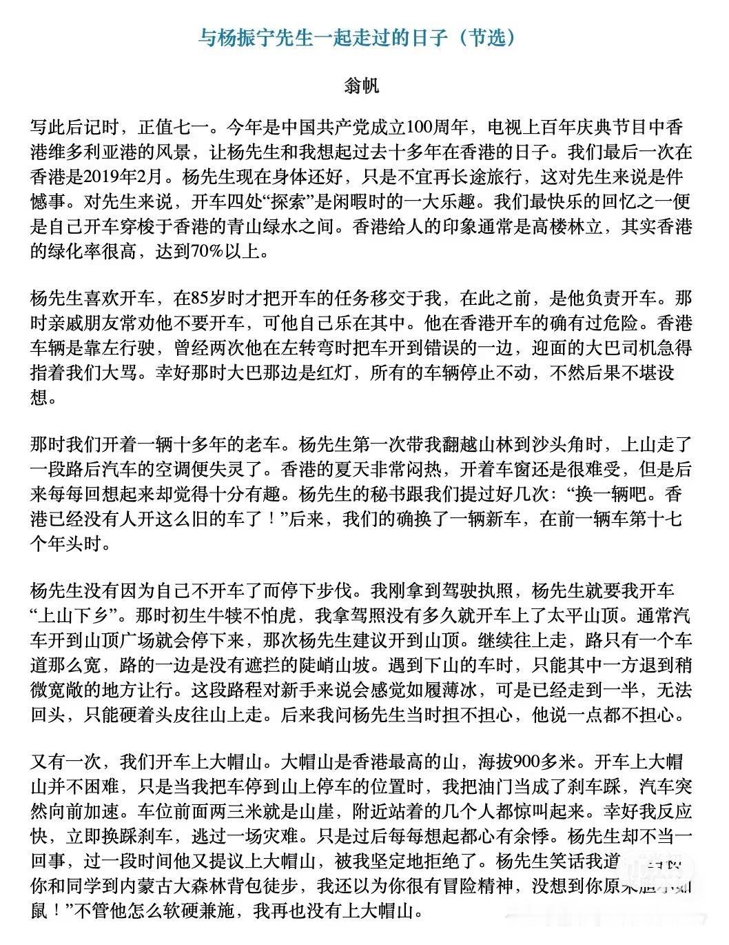 所有人里只有翁帆的悲痛是真真切切的吧… 看这站位,翁帆站在了所有亲人的首位,足以证明了翁帆在杨振宁老先生子女心中的地位。 我觉得她不会再找对象了,就是找了可能也不会满意,也没有这种又尊重包容她又引导她的结婚对象了,不管是找跟她同龄的还是年纪小的人都会伴随着各种让人疲倦的鸡毛蒜皮的事,“象牙塔中的象牙塔”这种形容看她之前的状态就知道不是说说而已,经历过这种生活真的会没办法再接受平庸的婚姻。 看完翁帆写的《与杨振宁先生一起走过的日子》,终于理解了,他们的爱情从来不是一个年轻人和一个老年人,杨先生老去的也只有肉体,灵魂始终是自由年轻的。 其实估计杨老也没想到自己能活100多,要不可能结婚时会要个孩子,现在都得上大学了。