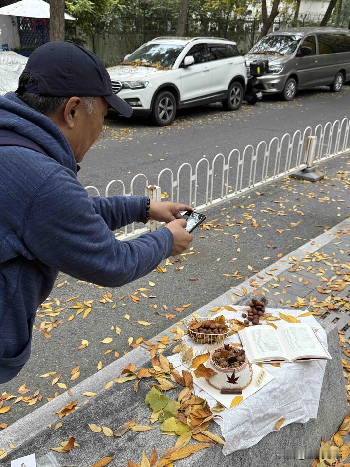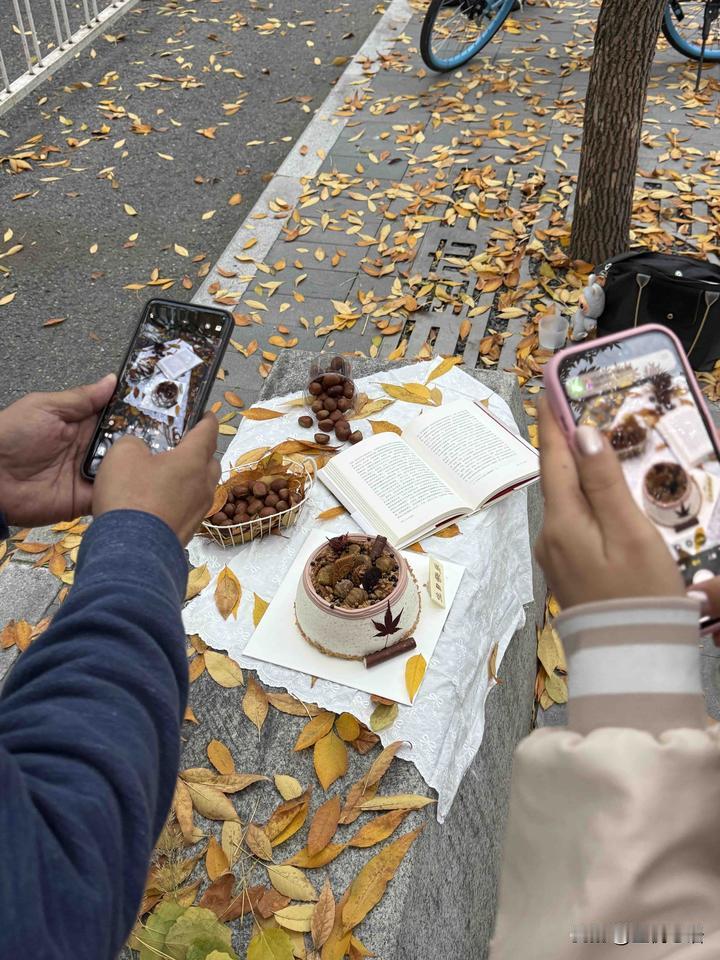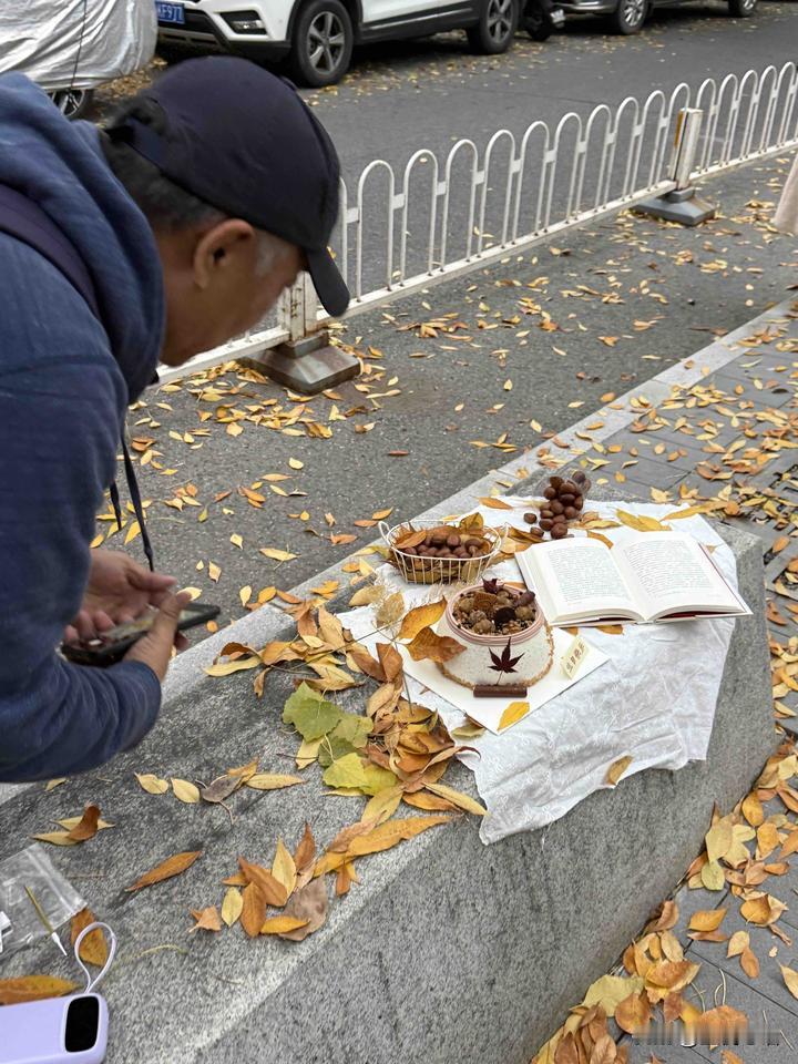 三里屯落叶里, 偶遇最“专业”的秋糕摄影师! 金黄的叶子刚飘下来, 就撞见个大爷举着设备拍秋糕。 姿势特板正, 镜头对准那块带着秋意的小蛋糕, 比我拍美食时认真十倍! 风一吹叶子晃, 大爷还特意等落叶飘到镜头里 才按快门,这专业度绝了! 秋天的氛围感, 被一块秋糕, 和一位认真的大爷拉满了~ 北京秋日拍照