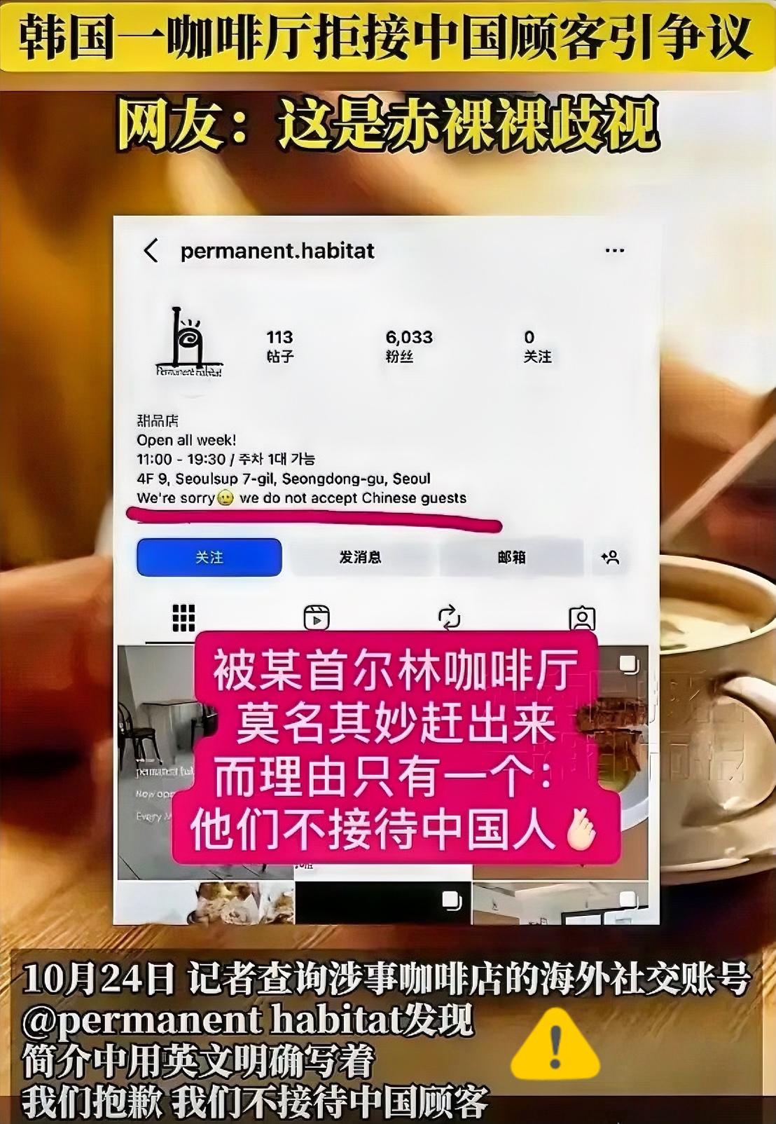 “丢人现眼!”点完咖啡的中国顾客竟被当场赶走,还贴英文告示说不接待中国人,老板嚣张回应“这就是我”,简直离谱! 之前多少中国博主免费帮它打卡涨流量,结果人家早就在社交账号藏了歧视声明。网友骂到评论区,老板半点不认错,这不是典型的“端碗吃饭、放碗骂娘”吗? 现在韩国不少商家都靠中国人撑客源,学中文、招中国店员拉好感,这家倒好,放着生意不做搞歧视,纯属自断后路。中国人花钱是图舒心,不是来受气的,少它一家根本无所谓。 你要是去韩国旅游,碰到这种歧视商家,会直接避雷吗?外国人到店消费