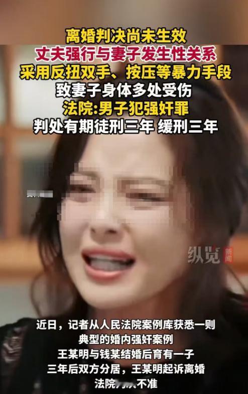 上海,王某明先起诉离婚,法院不允许;第二年,王某明又起诉离婚,法院允许了。他回去后,看到前妻钱某在收拾衣物,又忍不住强行和对方发生关系,结果被钱某告了。不过他的辩护律师称,虽然法院已判准予离婚,但判决书还未生效,两人还是夫妻关系,不应该认定为犯罪。最终法院还是判处王某明有期徒刑三年,缓刑三年,王某明并未上诉,判决已生效。 一起因离婚判决缓冲期引发的刑事案件,给所有夫妻敲响了警钟:婚姻关系的存续与否,从不是侵犯他人身体的借口,哪怕离婚判决书刚送达 5 天,“自愿同意” 仍是性行为不可逾越的底线。 王某明因在离婚判决生效前,强行与前妻钱某发生关系被判有期徒刑 3 年、缓刑 3 年的案例,用法律的重量,击碎了 “夫妻就默认同意” 的错误认知。 这起案件的脉络,藏着清晰的时间线和当事人复杂的心理纠葛,王某明与钱某婚后育有一子,随着婚姻矛盾加剧,两人早已分居。 起初王某明曾提起过一次离婚诉讼,却被法院驳回。这让王某明满肚子怨气:“不离婚,我俩就是法律上的夫妻,可她又不愿跟我同居,这算什么事?” 满心憋屈的王某明,在第二年再次提起离婚诉讼,10 月 8 日,法院最终判决准予两人离婚,判决书也已送达双方手中。 此时的钱某对王某明早已失望透顶,王某明也一心想分道扬镳,看似这段破碎的婚姻即将落幕,可钱某心里还藏着一丝顾虑 。 她并非不愿离婚,只是想给孩子一个 “表面完整” 的家,哪怕两人过不到一起,至少在孩子面前能维持和睦,让孩子感受到父母双方的爱。 10 月 13 日,距离法院判决仅过去 5 天,钱某想着趁判决生效前,去两人曾共同居住的住处收拾个人物品。 让她没想到的是,王某明竟也莫名出现在了这里。见到王某明,钱某本就没什么好脸色,全程不愿多言,只想尽快收拾完离开。 可王某明却没打算让她轻易走。他看着眼前的钱某,想到 “判决书已送但还没生效,我俩名义上还是夫妻”,一时冲动下,不顾钱某的激烈反抗,强行与其发生了性关系。 事后,屈辱与愤怒交织的钱某没有选择沉默,当即报警并提起诉讼。 面对指控,王某明始终固执地认为 “我们还没正式生效离婚,夫妻间发生关系怎么算犯罪”。但法院的判决给出了明确答案:性行为的合法性,核心在于 “是否自愿”,而非婚姻身份。 司法实践中,只要存在暴力、胁迫或明显违背对方意愿的情形,即便处于婚姻关系中,也构成强制性交罪。 最终,王某明被判处有期徒刑三年,缓刑三年,判决生效后他未提起上诉,为自己的冲动付出了沉重代价。 这起案件的法理逻辑十分清晰:婚姻从不是 “身体支配权” 的契约。无论是分居、起诉离婚,还是判决未生效的缓冲期,一方的身体自主权始终受法律保护。 王某明的错误认知,恰恰是许多人容易踩中的雷区 , 误以为 “夫妻身份” 能成为强迫性行为的豁免牌,却不知这种行为早已触碰刑法红线。 婚姻关系≠“默认同意”,哪怕是多年夫妻,只要一方明确拒绝,强行为之就是违法,严重者构成犯罪。 婚判决的 “生效缓冲期” 是法律留给双方的冷静空间,而非肆意妄为的机会,任何纠纷都该通过合法途径解决,冲动只会酿成大错。 其三,父母的冲突对孩子的伤害深远,王某明的获刑让家庭彻底破碎,孩子不仅要面对父母离婚的事实,还要承受父亲被刑事制裁的创伤,家庭监护与成长环境都需重新构建。 对深陷婚姻纠纷的人而言,此案更是一份 “避坑指南”:遭遇婚姻裂痕务必走法律程序,保持理性克制。 处理共同财物时,尽量请亲友见证或律师介入,避免单独接触,若遭遇强迫或暴力,第一时间报警并保留录音、伤情单等证据,必要时向妇联、法律援助机构求助。 归根结底,这起案件是对婚姻认知的一次深刻纠偏,它用刑事判决告诉我们:任何关系里的性行为,都必须建立在双方自愿的基础上。 尊重对方的意愿,守住法律的底线,才是处理亲密关系矛盾的唯一安全路径,切莫让 “夫妻身份” 成为触碰法律红线的借口。 对于此事,大家如何看? 信息来源:纵览新闻